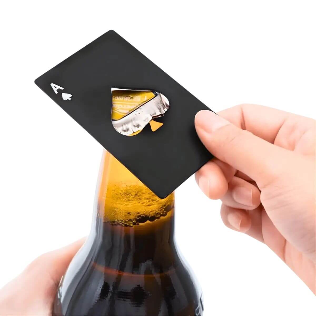 O abridor de garrafas em formato de carta de baralho na cor preta é um acessório compacto para abertura de tampas metálicas tipo “crown cap”. Seu formato plano, semelhante a um cartão, facilita o transporte no bolso, na carteira ou em kits de bar e cozinha.