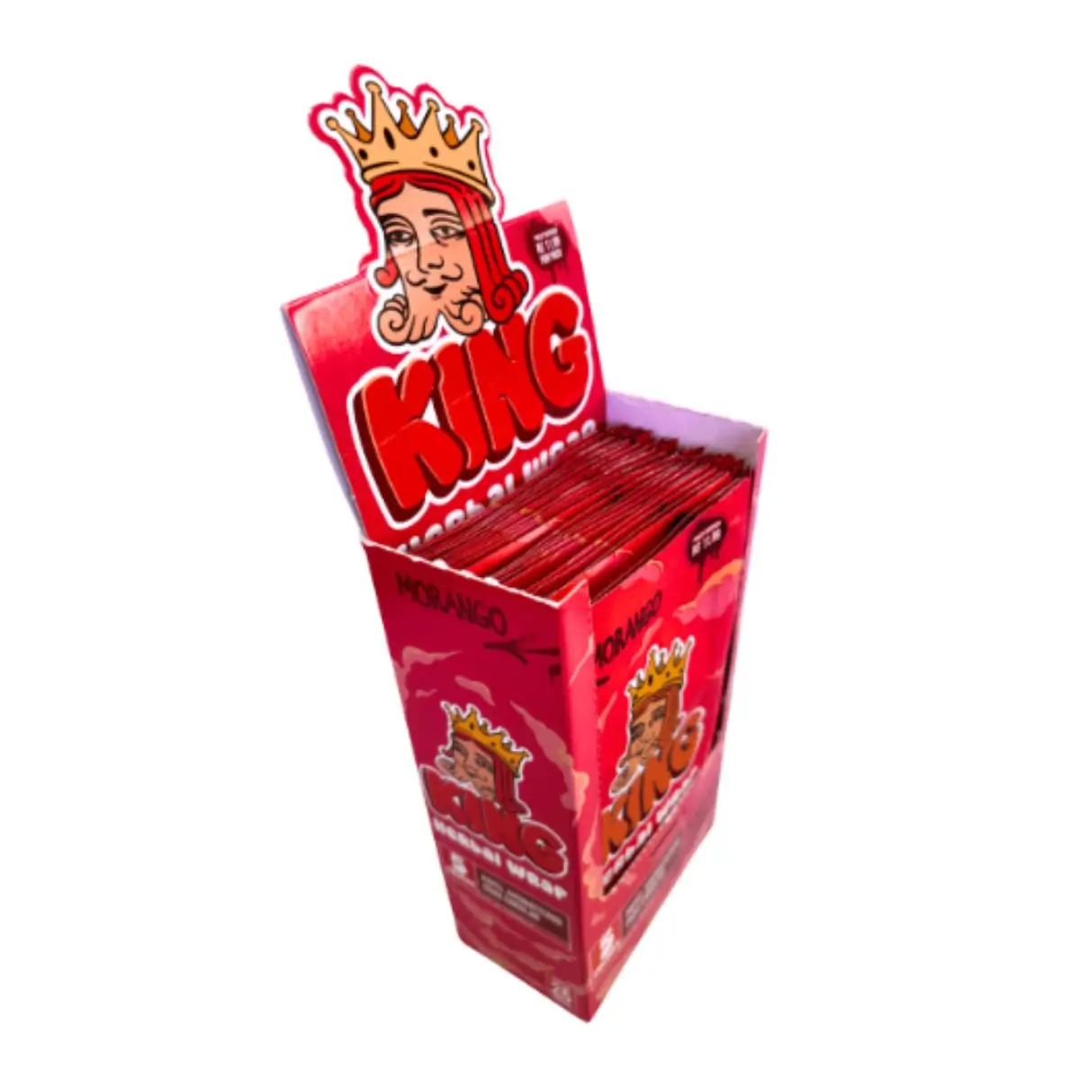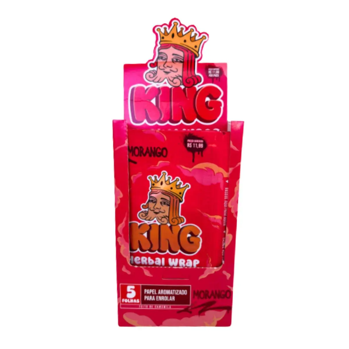 Display com 25 envelopes de blunts herbais King Blunt sabor morango, sem tabaco, com 5 folhas king size aromatizadas por envelope, em papel homogeneizado de fibras naturais.