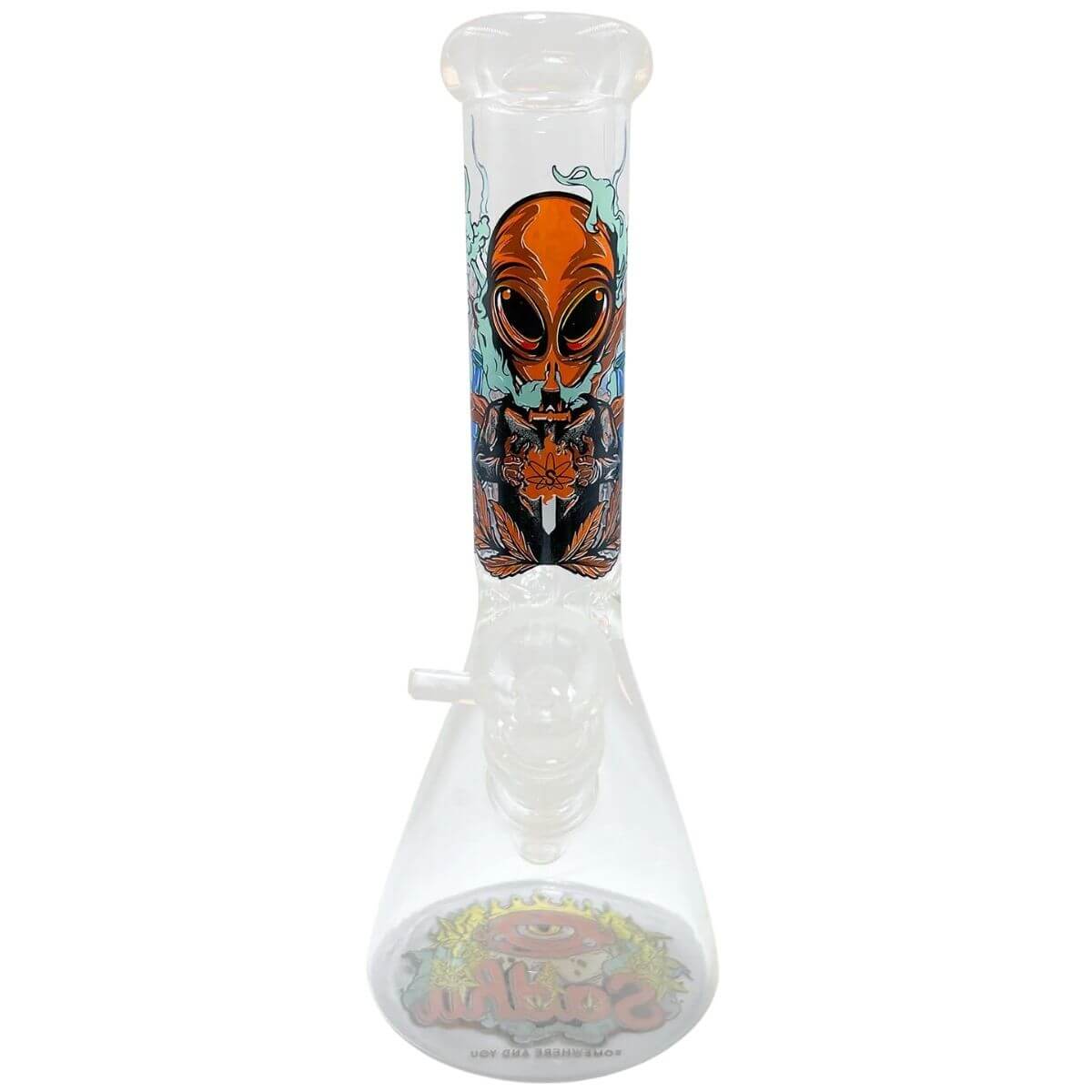 Bong de vidro Sadhu da Coleção Psicodélica, modelo ET Alucinado, em vidro borossilicato com 26 cm de altura, base redonda estável e parede de aproximadamente 5 mm. Incluso 1 bong de vidro, 1 tubo de downstain e 1 bowl.