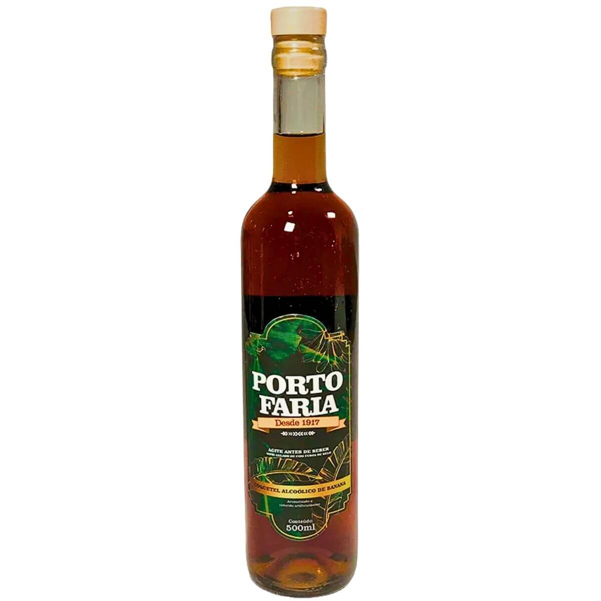 Coquetel alcoólico Porto Faria sabor banana, garrafa 500 ml, graduação alcoólica 18%. Bebida pronta para consumo, com perfil frutado e adocicado.