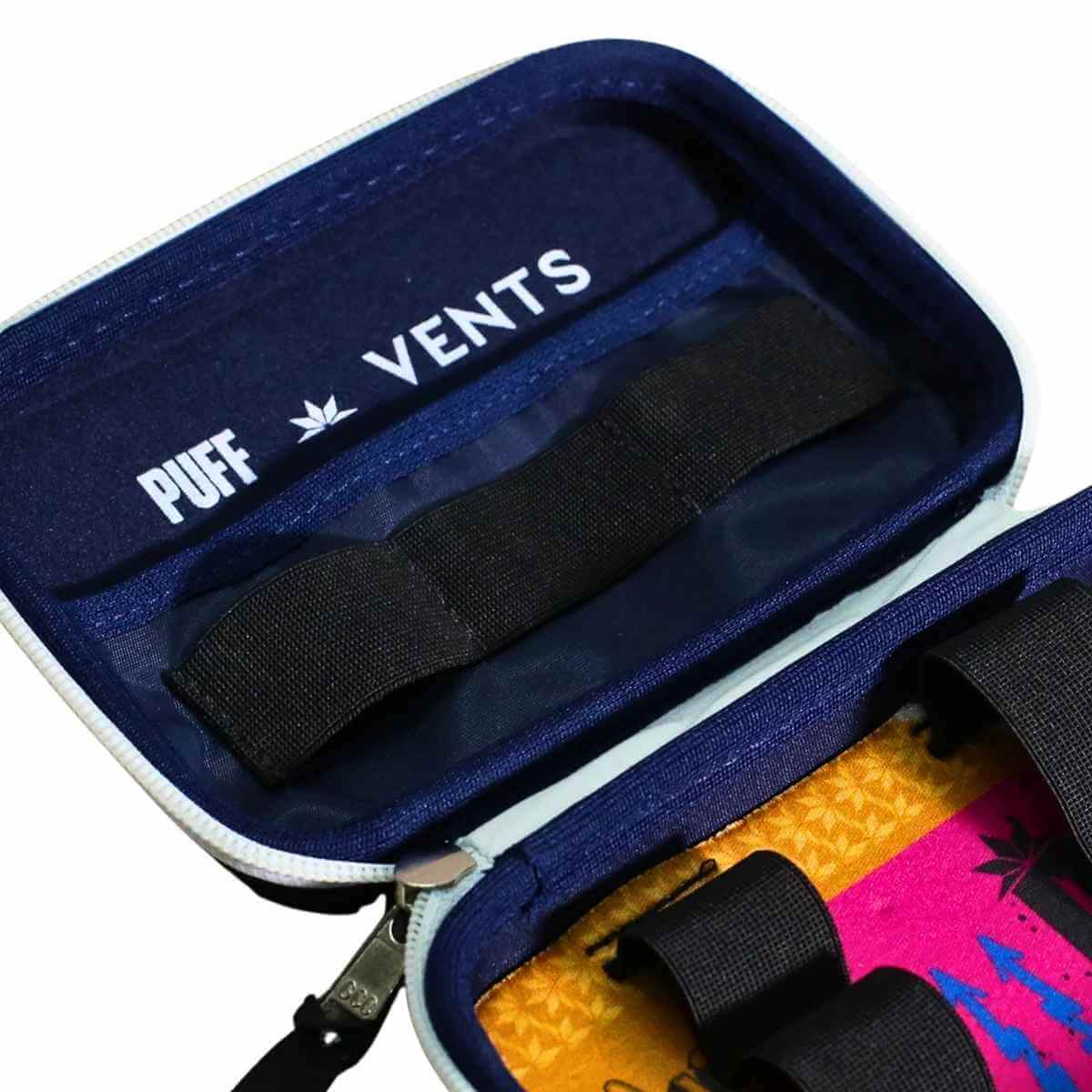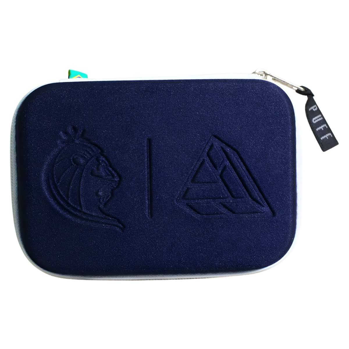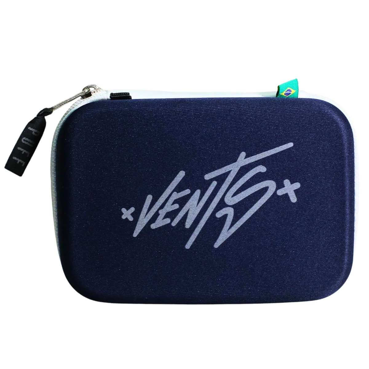 O Case Clássico Collab Vents é produzido em EVA com revestimento têxtil e fechamento em zíper. Essa combinação oferece estrutura rígida, boa durabilidade e proteção adequada para acessórios pessoais, atendendo à demanda de lojistas que buscam revenda de cases Puff com acabamento consistente.