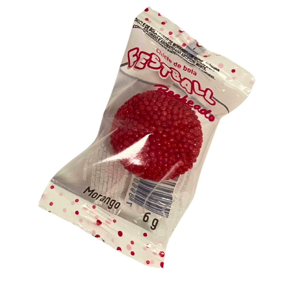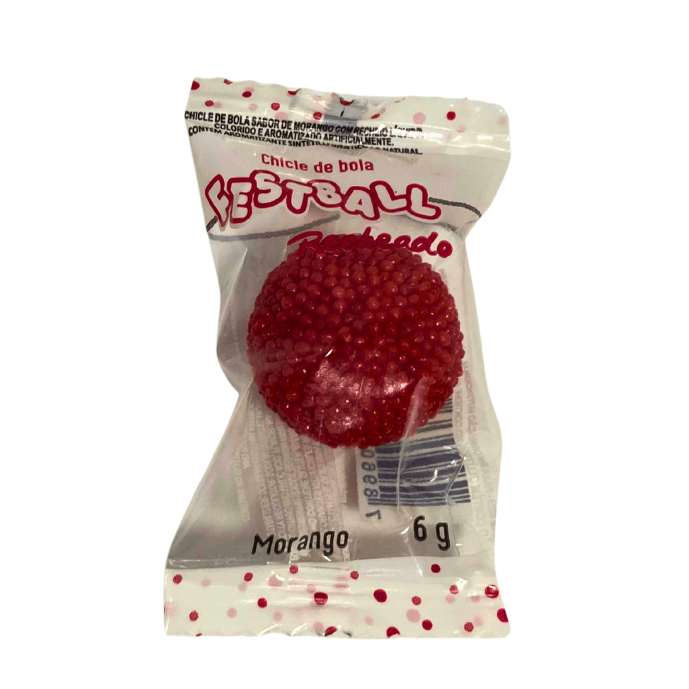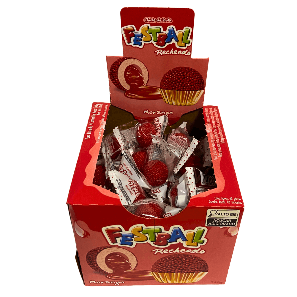 É um chiclete de bola da marca Sukest, linha Festball, com superfície coberta por bolinhas crocantes e recheio líquido sabor morango. Vem em display com aproximadamente 40 unidades, indicado para revenda em bombonieres e outros pontos de venda de guloseimas.