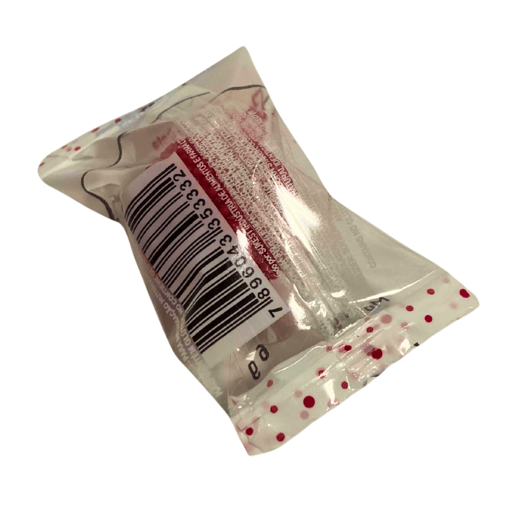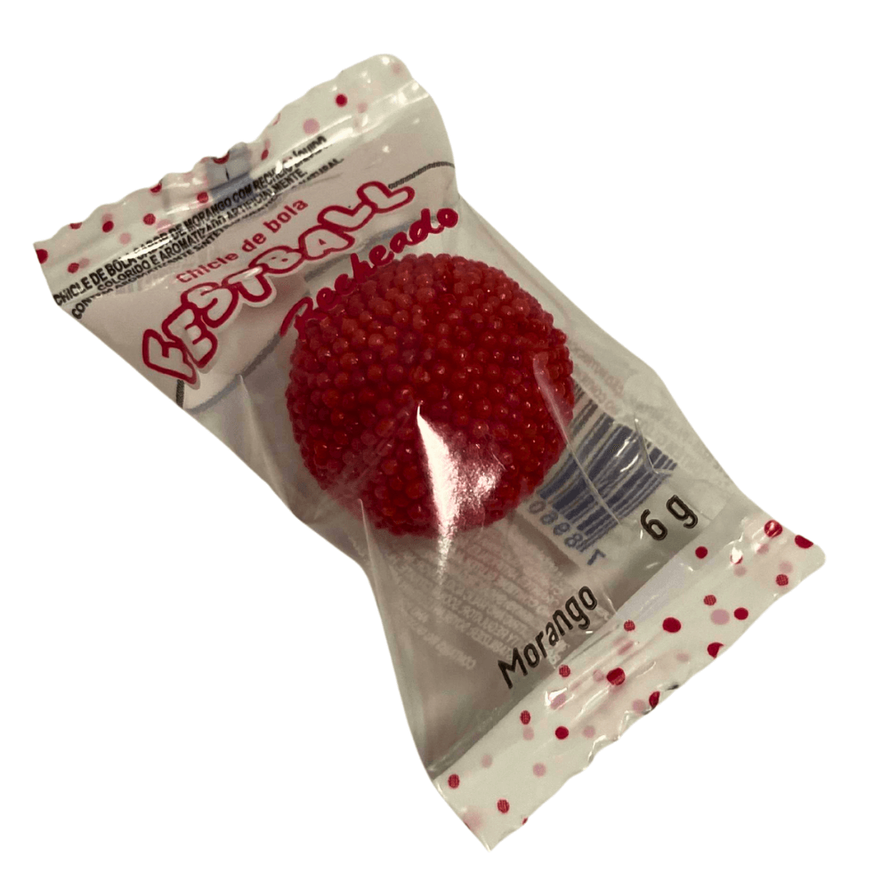 - Material/Composição: Chiclete de bola com confeito tipo miçanga e recheio líquido sabor morango