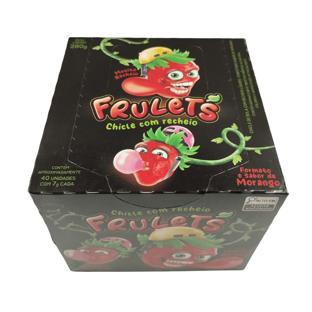 Chiclete mastigável sabor morango Sukest Frulet’s em display com 40 unidades, indicado para consumo no dia a dia como opção de doce. Display com 40 unidades