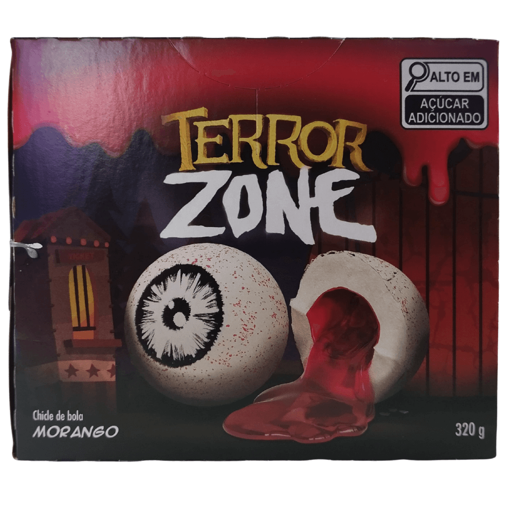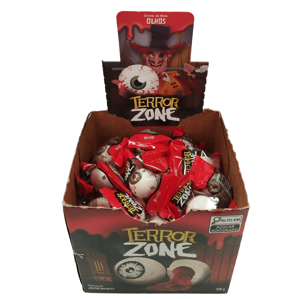 Com sabor de morango e identidade visual temática Terror Zone, o produto se destaca pela apresentação chamativa e pelo formato prático para consumo imediato. O display otimiza a exposição, permitindo que as unidades fiquem visíveis e acessíveis ao consumidor, contribuindo para um sortimento variado de confeitaria.