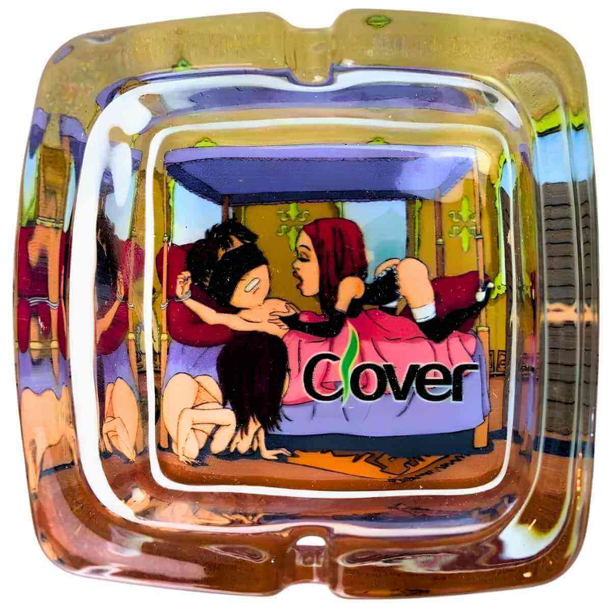 Cinzeiro quadrado de vidro Clover com estampa In a Bed, estrutura resistente e bordas elevadas para acomodação de cinzas e resíduos em superfícies planas.