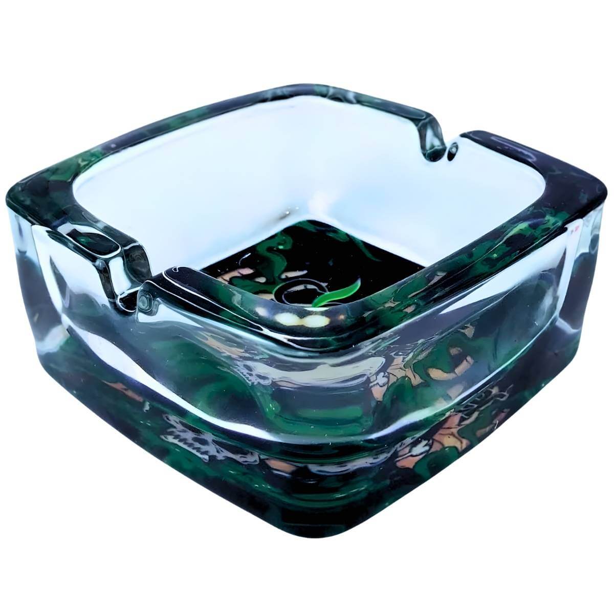 Cinzeiro de vidro quadrado Clover com estampa Skull Smoke, estrutura espessa e bordas fundas que auxiliam no acondicionamento de cinzas em mesas e superfícies de apoio.