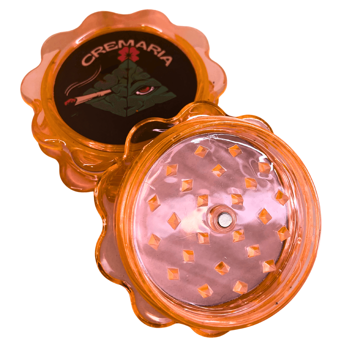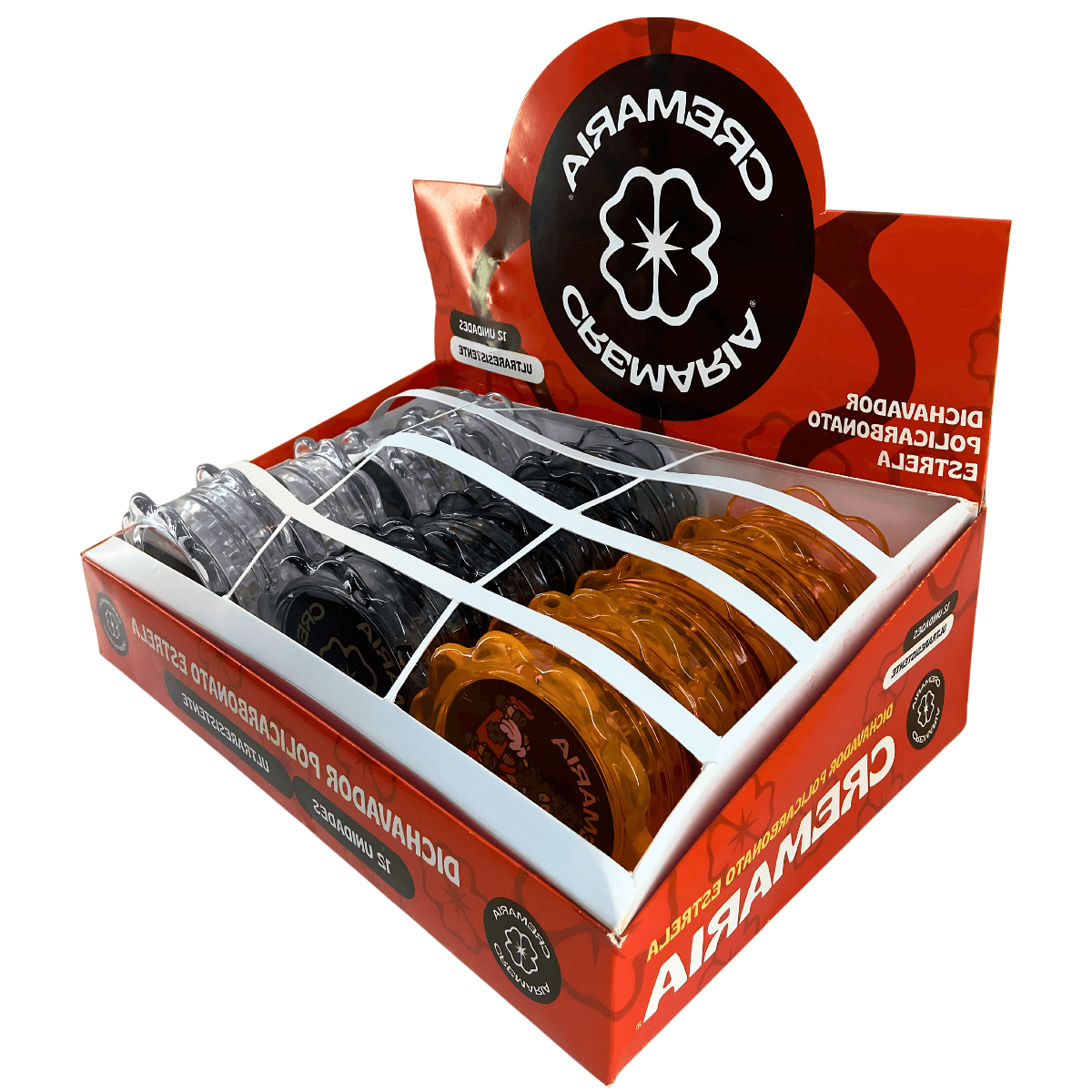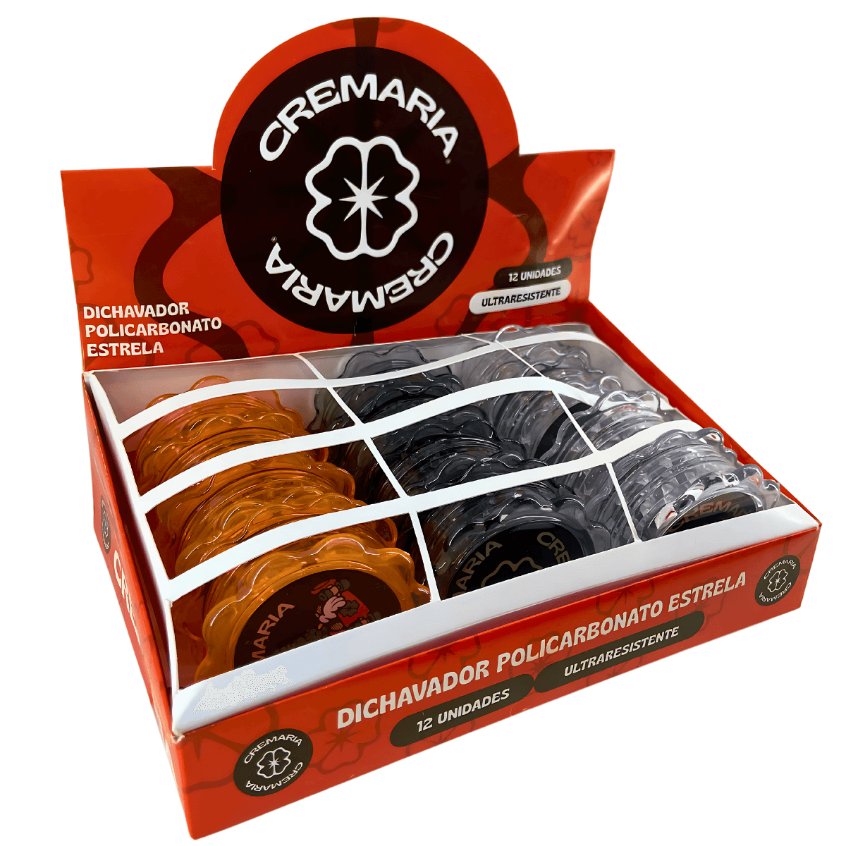 Dichavador Cremaria em policarbonato com formato de estrela, estrutura leve e resistente, composto por múltiplas partes para triturar materiais secos. Display com 12 unidades individuais.
