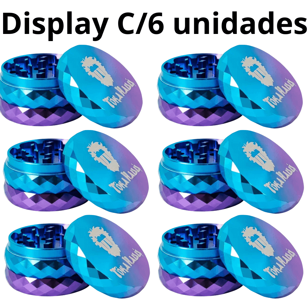 1 (um) display com 6 (seis) dichavadores de alumínio Toka Hauu 4 partes em cores sortidas, acondicionados em embalagem própria para exposição.