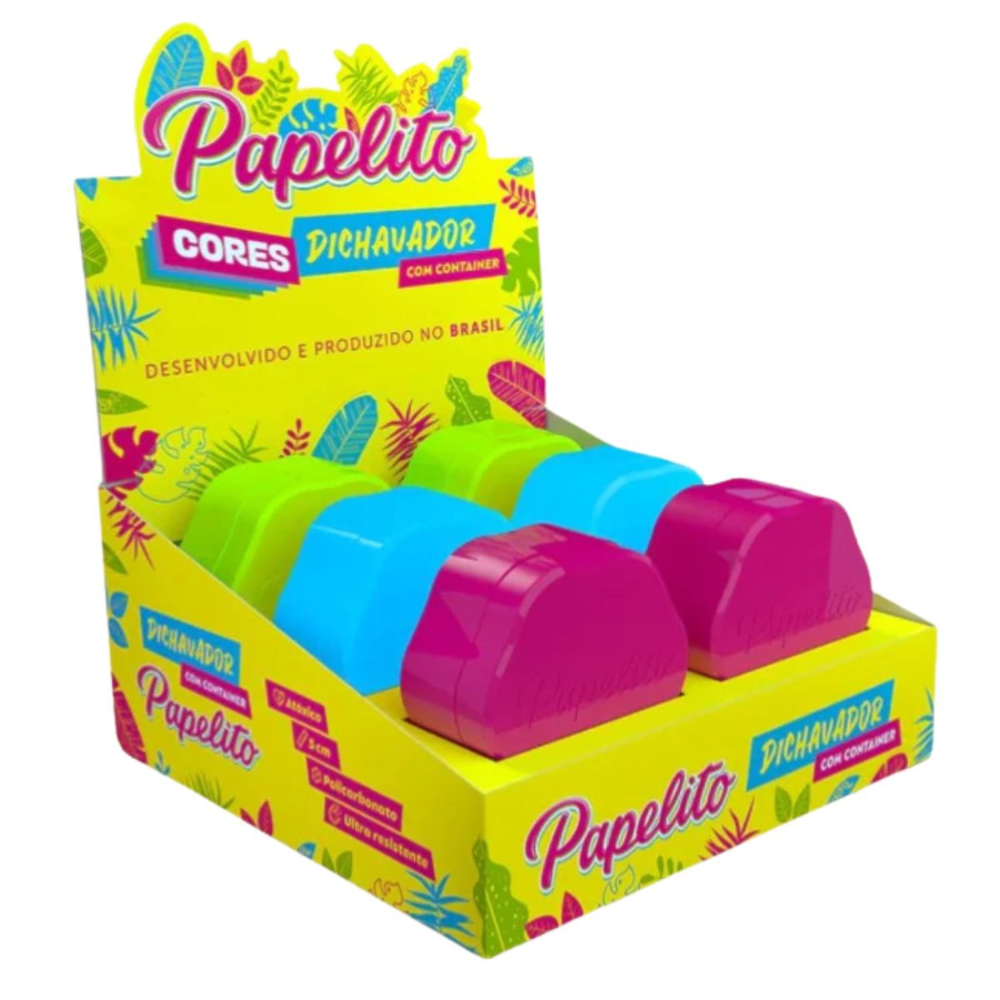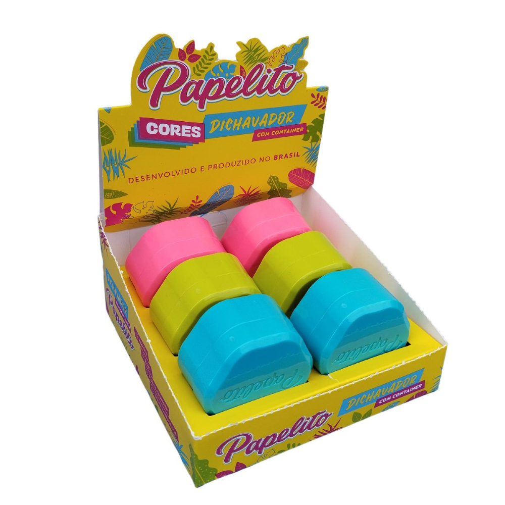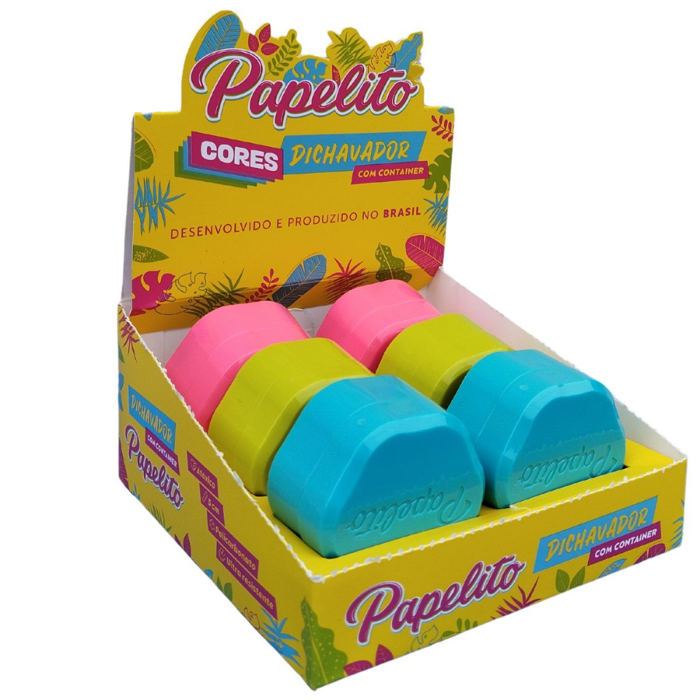 Dichavador Papelito em policarbonato com container integrado, modelo colorido, formato compacto de uso manual, display com 6 unidades em cores variadas.