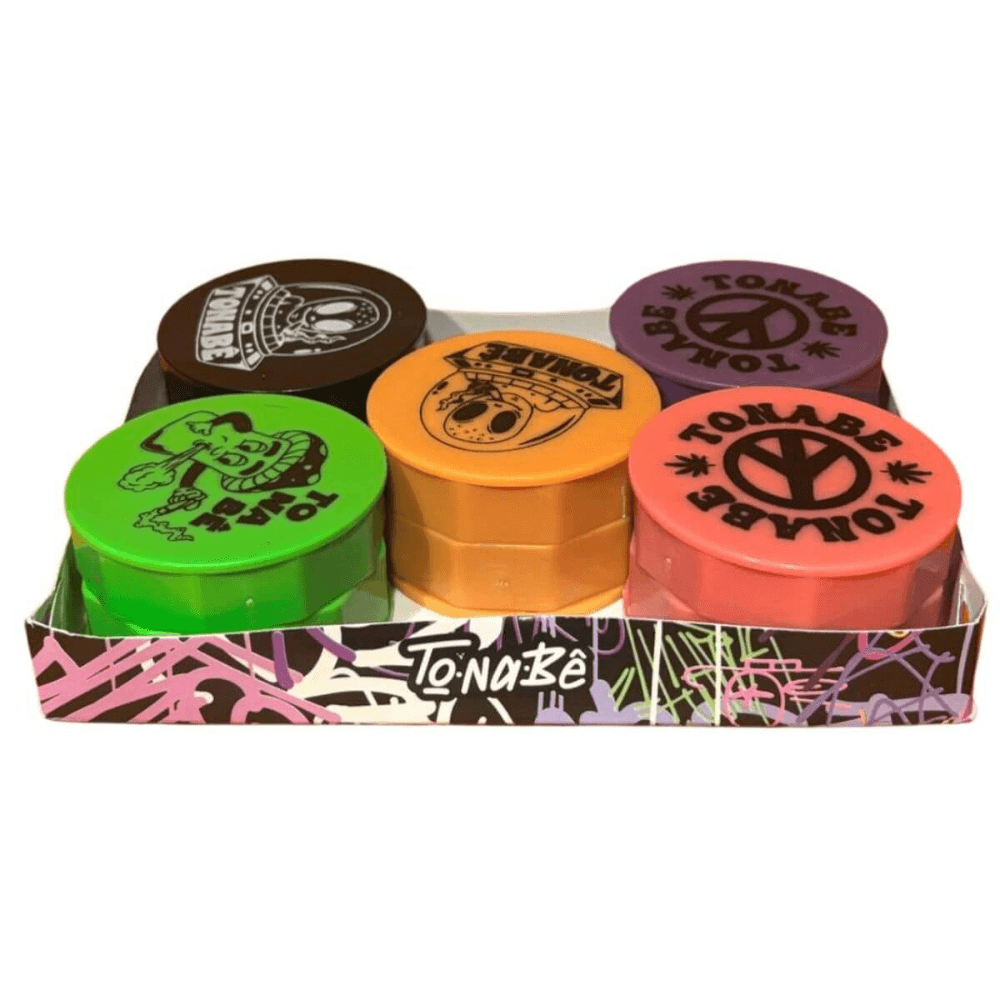 Conjunto com 5 dichavadores Tonabe de 2 partes, em display original, indicados para triturar ervas secas e especiarias com praticidade.