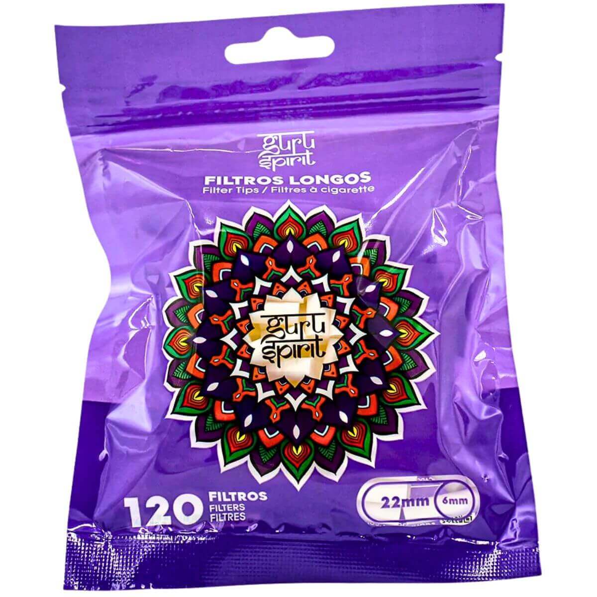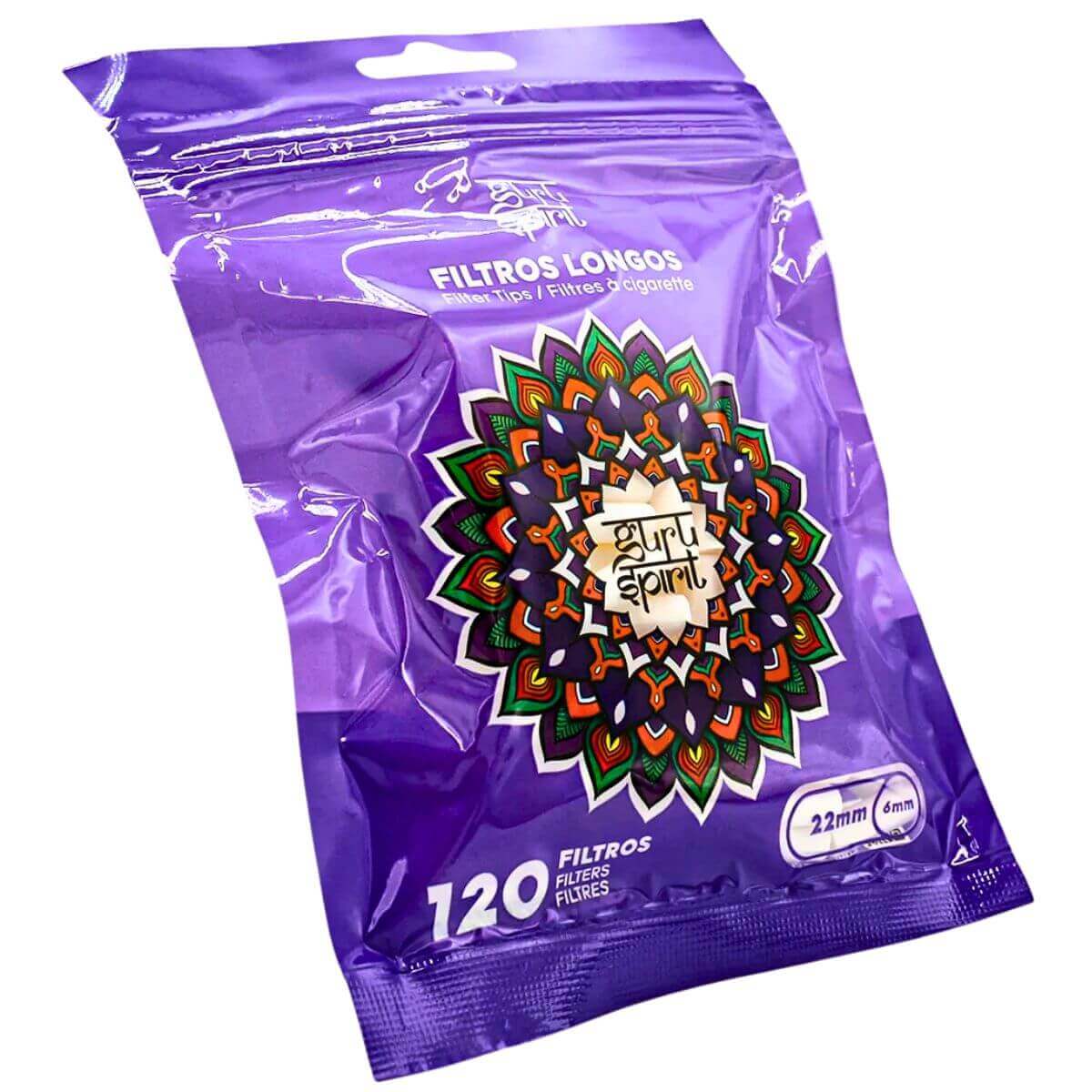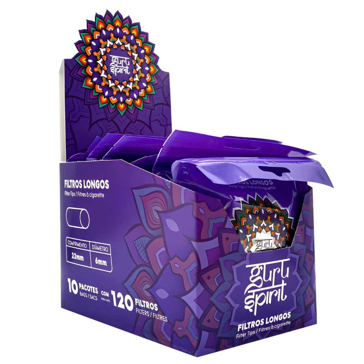 Filtros cilíndricos longos Guru Spirit Sadhu, tamanho 22mm x 6mm, em display com 10 bags, cada uma com 120 unidades, para maior conforto e padronização.