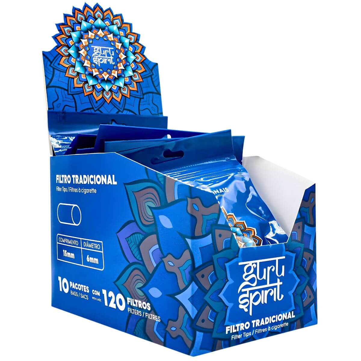 Display com 10 bags de filtros cilíndricos Guru Spirit Sadhu tradicionais, 15 mm x 6 mm, indicado para quem busca padronização e praticidade em acessórios filtrantes.