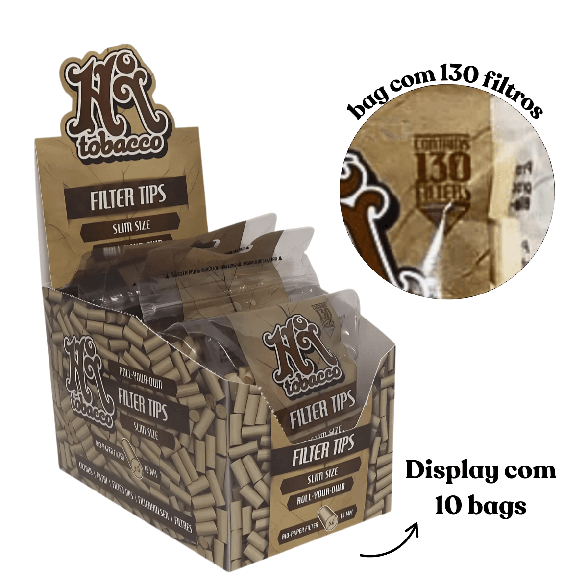 Filtros biodegradáveis Hi Tobacco Brown Slim Size em acetato de celulose marrom 6 x 15 mm, display com 10 bags zip lock, 130 unidades por bag.
