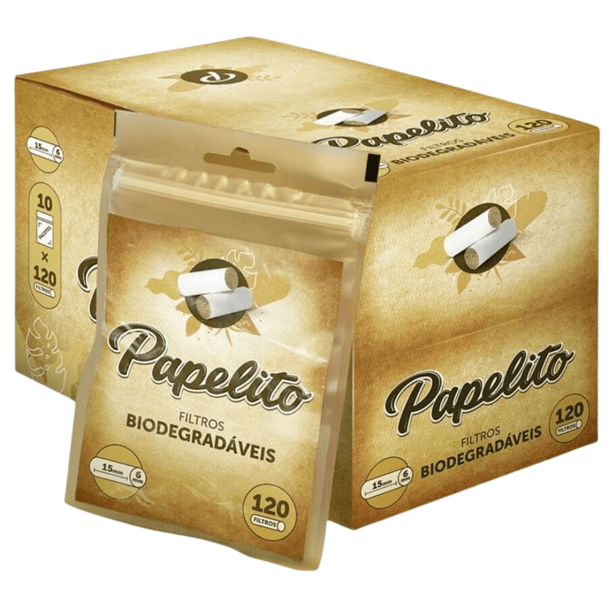Display Papelito com 10 bags de filtros cilíndricos biodegradáveis, 100% celulose, 6 mm x 15 mm, 120 unidades por bag em embalagem reutilizável com fecho ziplock.
