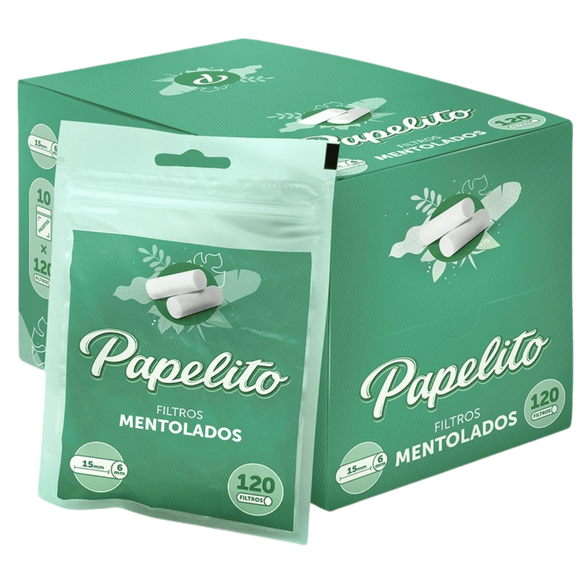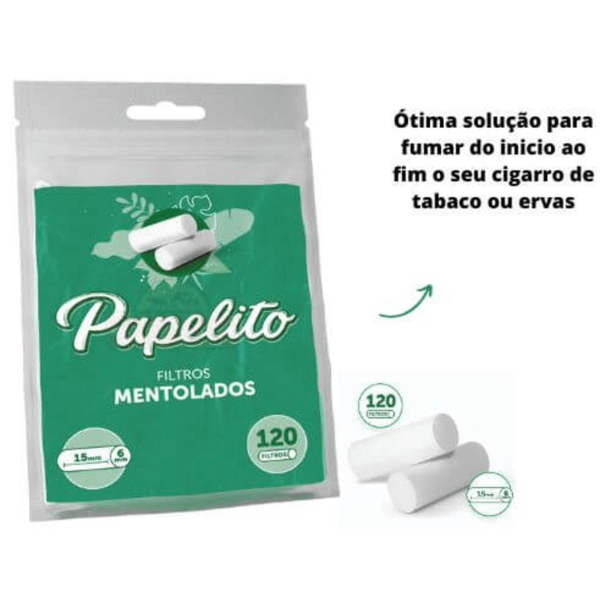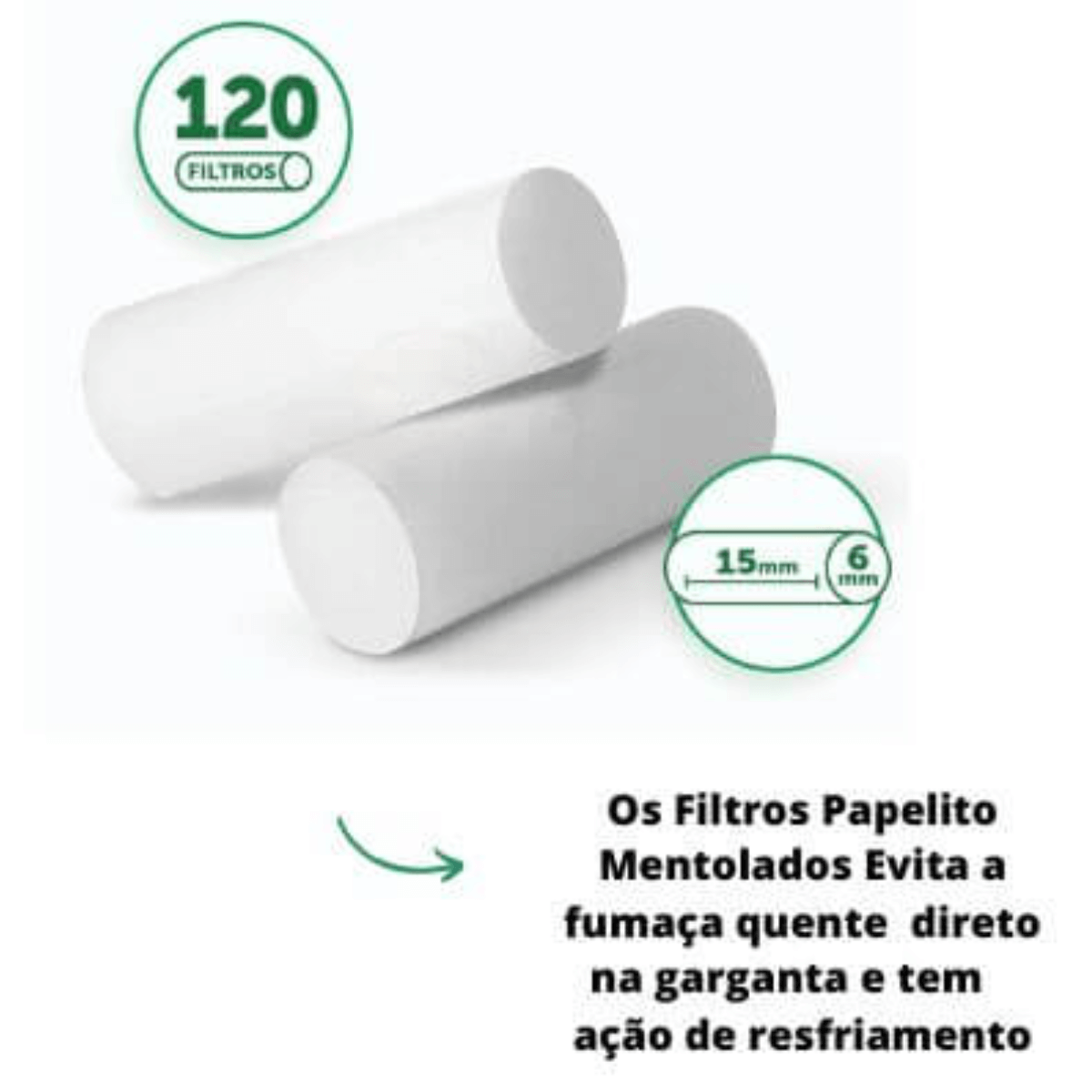 Os filtros mentolados Papelito são produzidos em acetato, com dimensões aproximadas de 6 mm de diâmetro por 15 mm de comprimento. Essas medidas atendem ao padrão tradicional de filtros de acetato, facilitando o uso em diferentes montagens compatíveis.