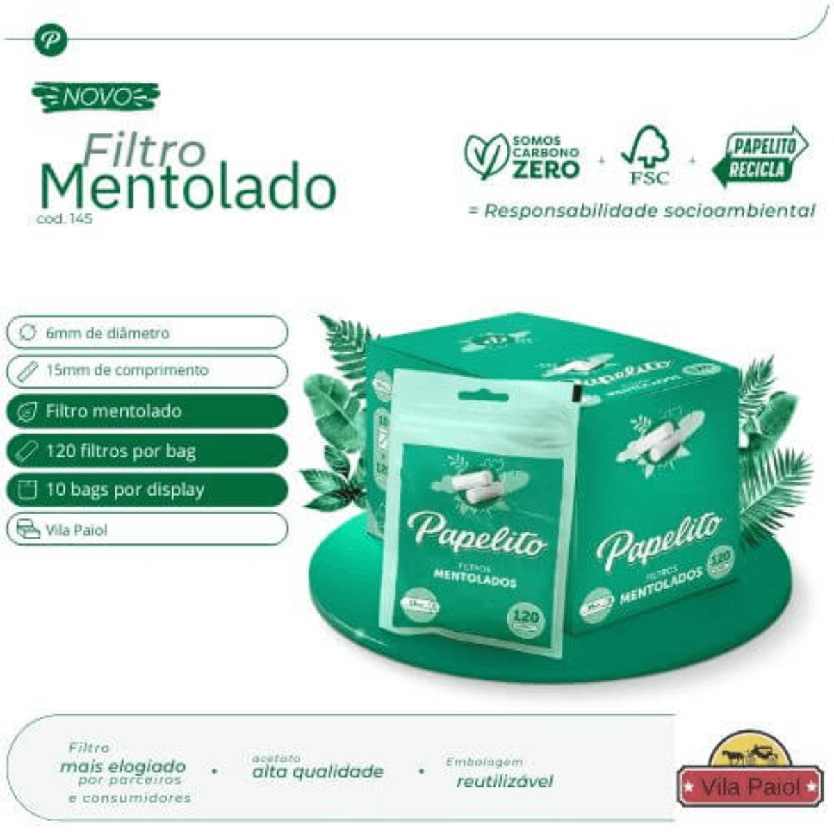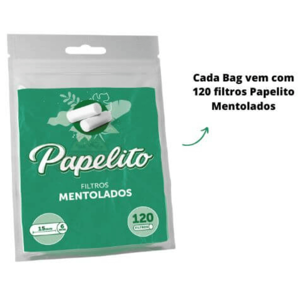 Cada display de Filtro Papelito Mentolado Papelito acompanha 10 bags, e cada bag contém 120 filtros de acetato, totalizando 1.200 filtros por unidade. A Vila Paiol trabalha como fornecedor de filtros Papelito, garantindo padronização nesse formato de fornecimento.