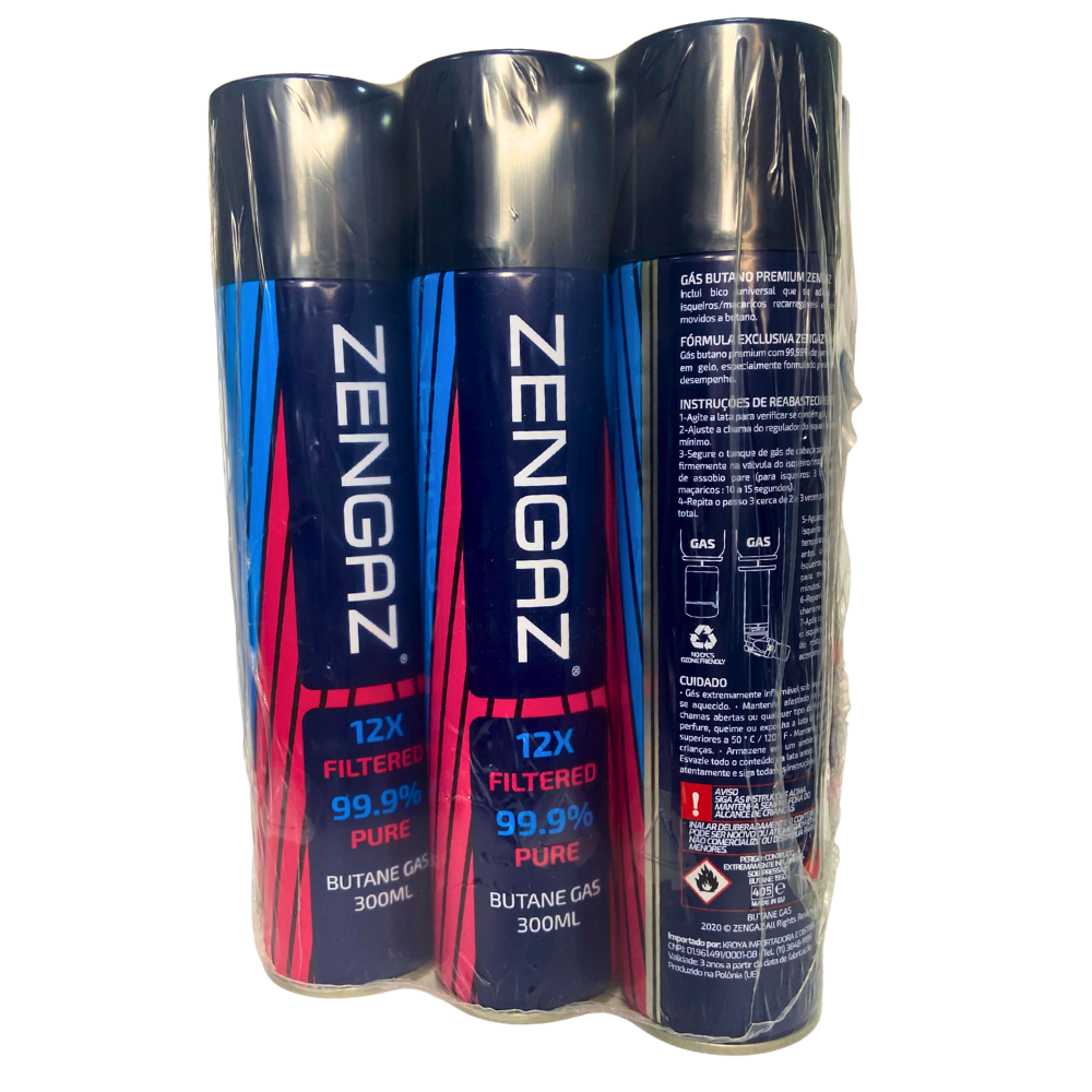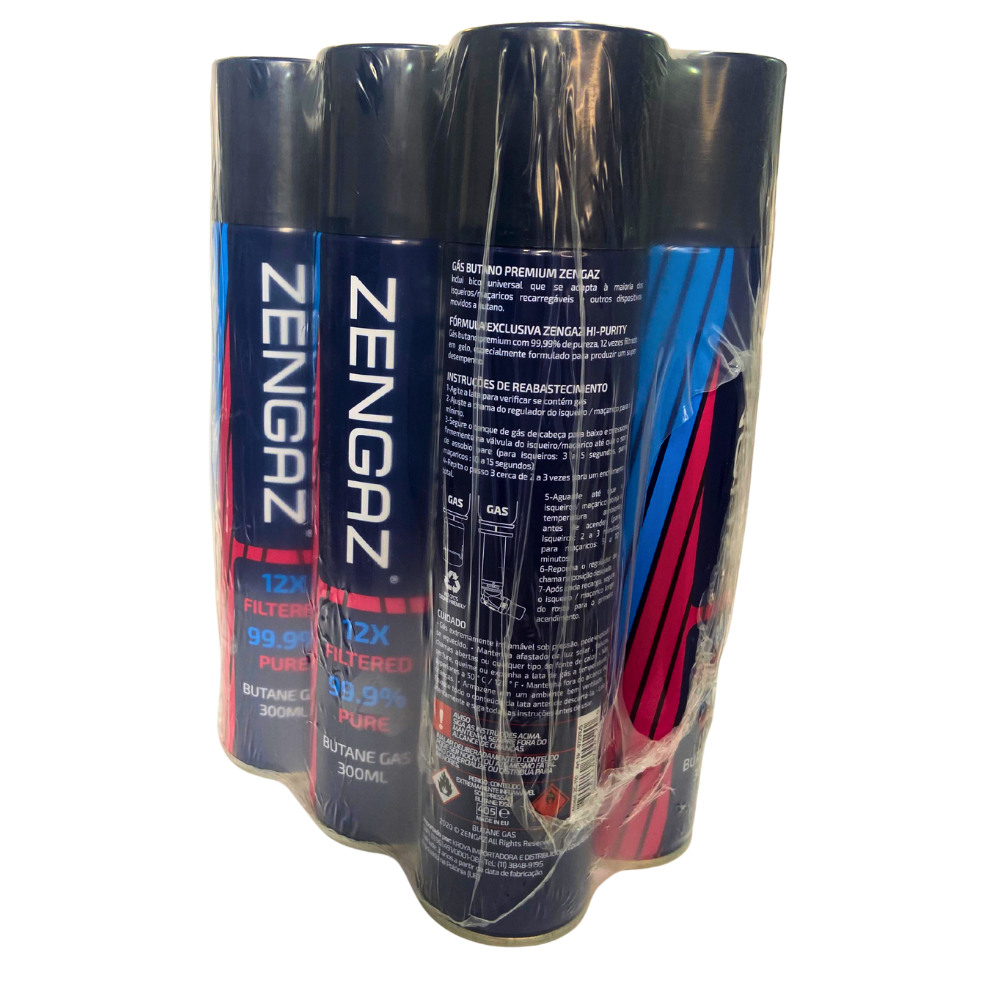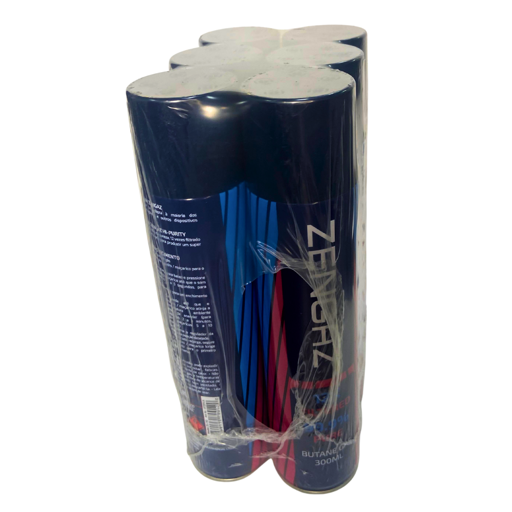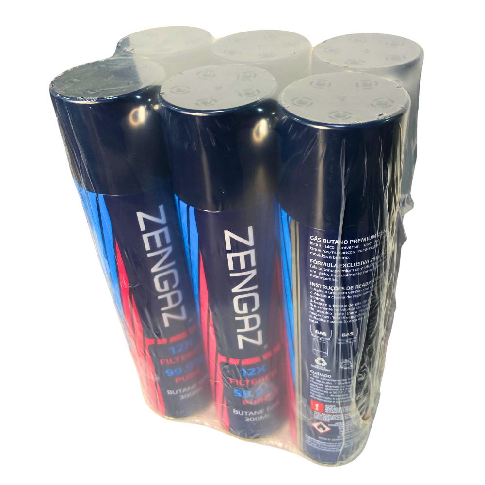 Gás butano Zengaz em lata de 300 ml, pack com 6 unidades, indicado para recarga de isqueiros e maçaricos, com alta pureza e válvula compatível com diversos modelos.