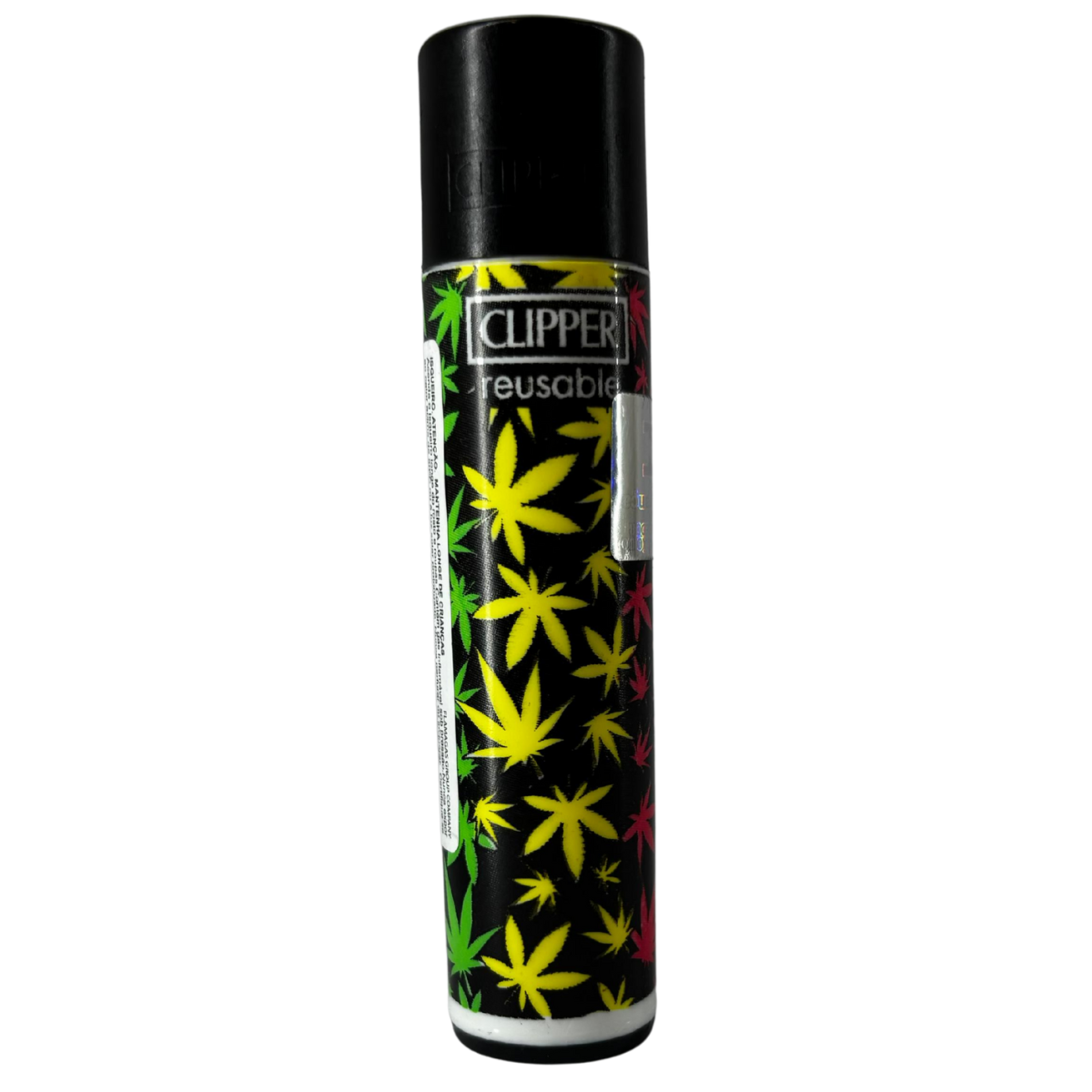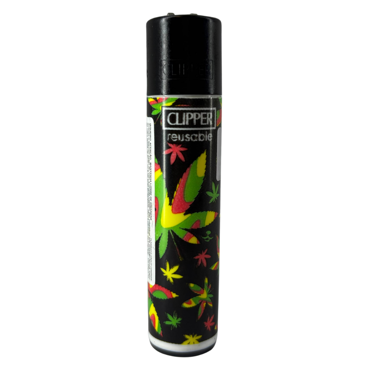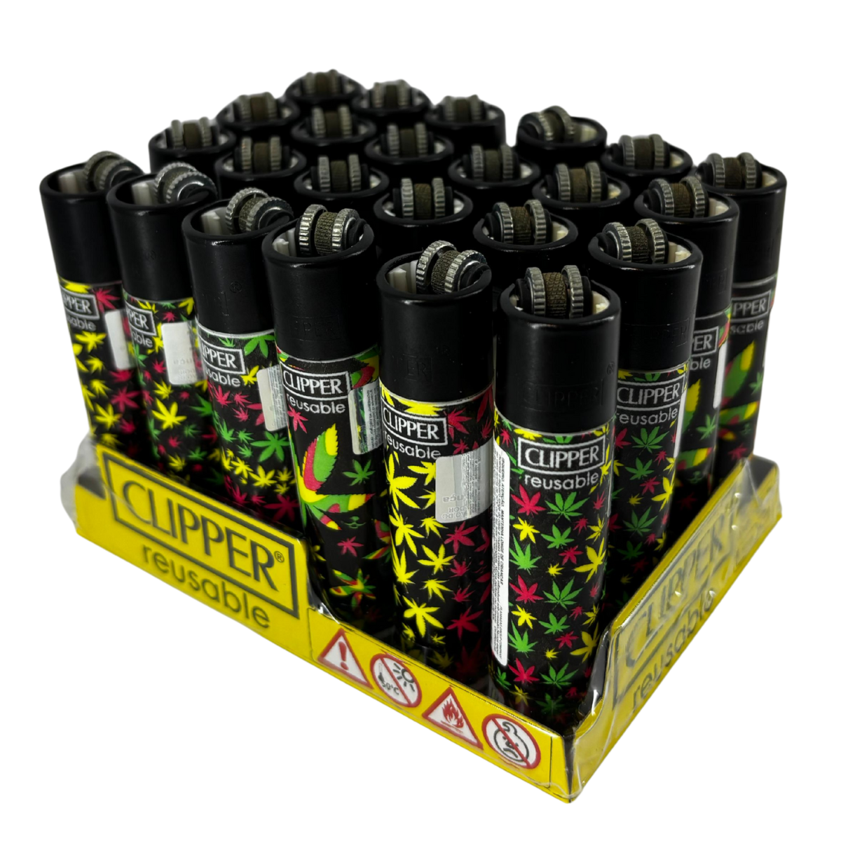 Isqueiro Clipper recarregável tamanho grande modelo D24 Jamaican Pattern, corpo resistente e pedra substituível, organizado em display com 24 unidades assortidas.