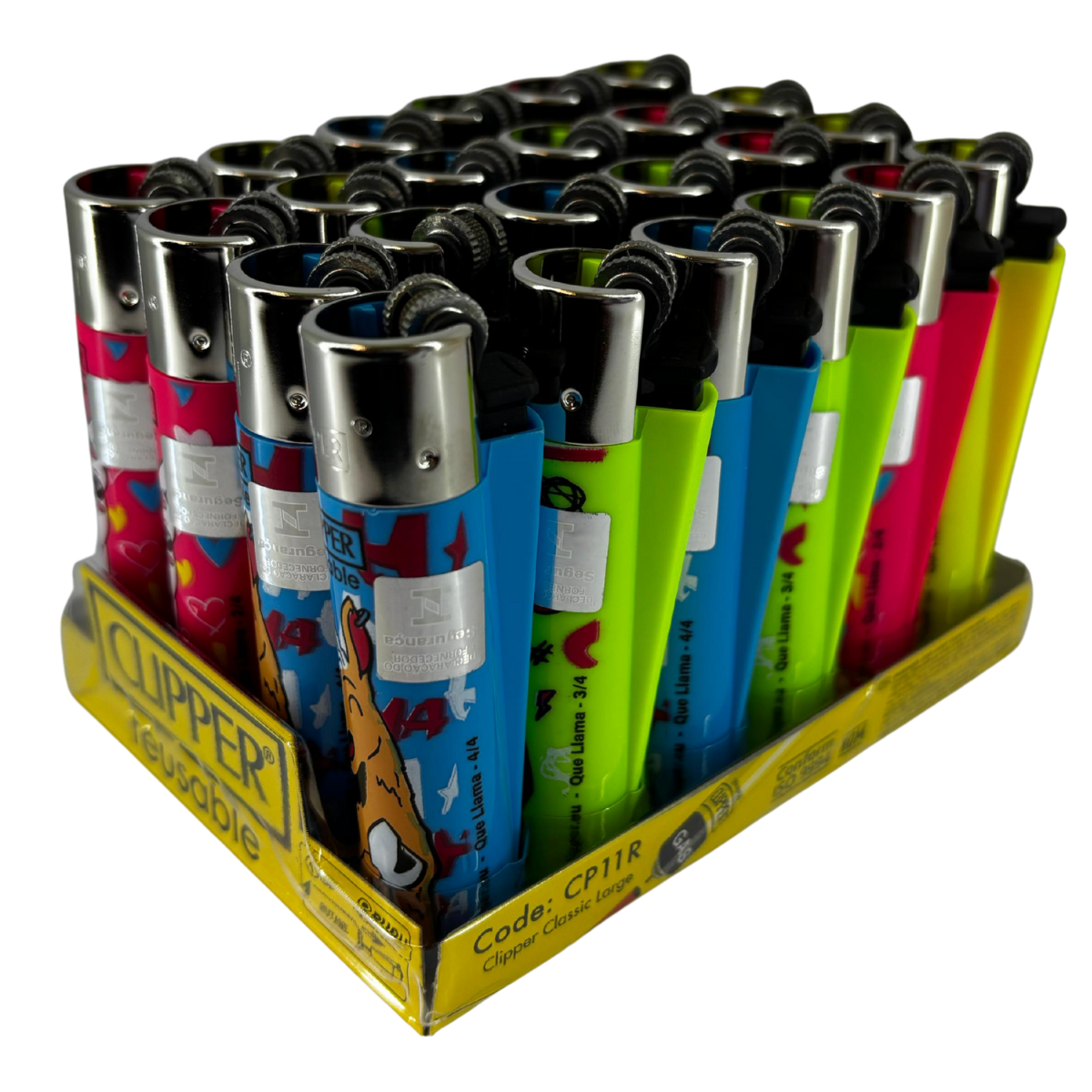 O display é composto por 24 isqueiros Clipper grandes, modelo D24 CP11R Que Llama + LB, com artes sortidas da coleção Que Llama, organizados em base expositora pronta para ponto de venda.