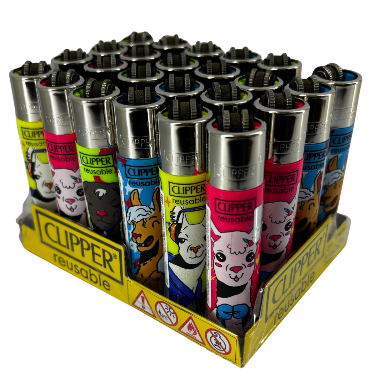O display com 24 unidades reúne isqueiros Clipper em cores e artes variadas, organizados em base expositora pronta para gôndolas, vitrines e balcões. A proposta é atender pontos de venda que necessitam de um mix visualmente atrativo, com produto conhecido pela durabilidade e pela padronização de funcionamento.