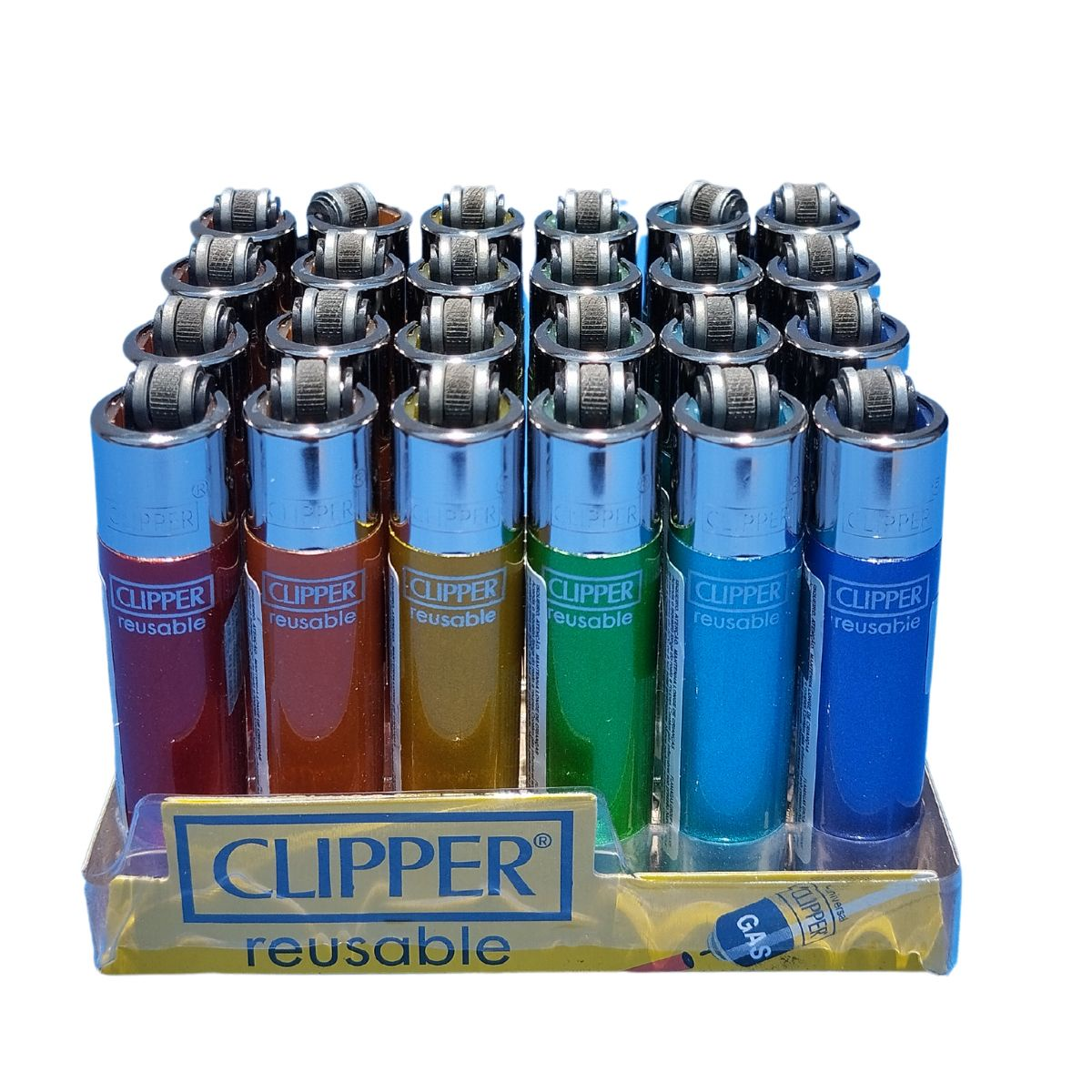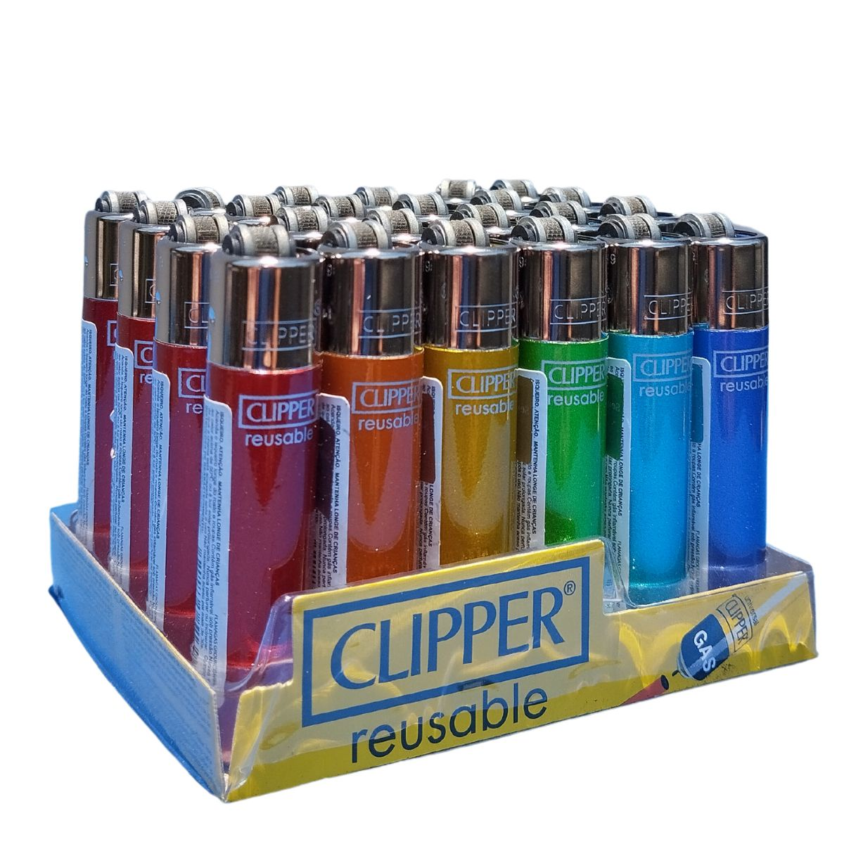 Cada display pequeno D24 contém 24 isqueiros Clipper modelo CP22RH Crystal Rainbow, já organizados em base expositora. Isso facilita a gestão de estoque e o planejamento de revenda de isqueiros Clipper em pontos de venda especializados.