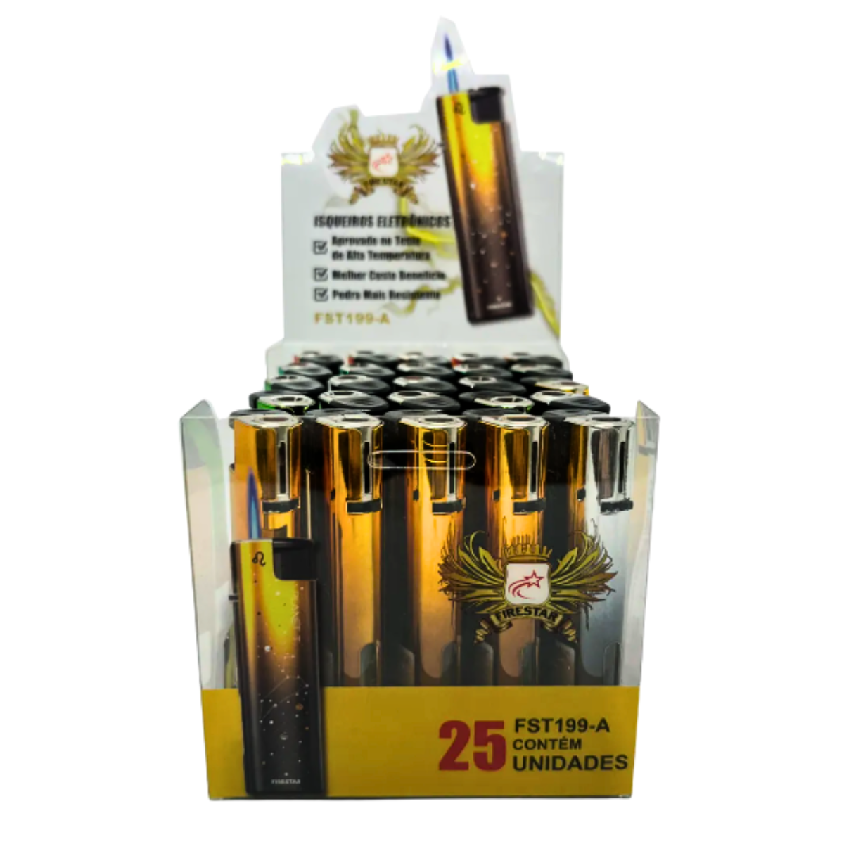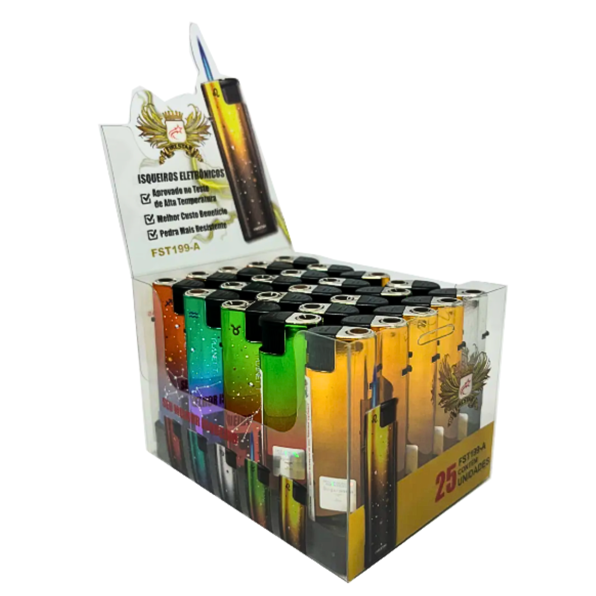 Cada display do isqueiro maçarico Fire Zodiac FST199-A contém 25 unidades do mesmo modelo, o que facilita a compra com distribuidor e a reposição organizada em pontos de venda que trabalham com revenda de isqueiro maçarico.