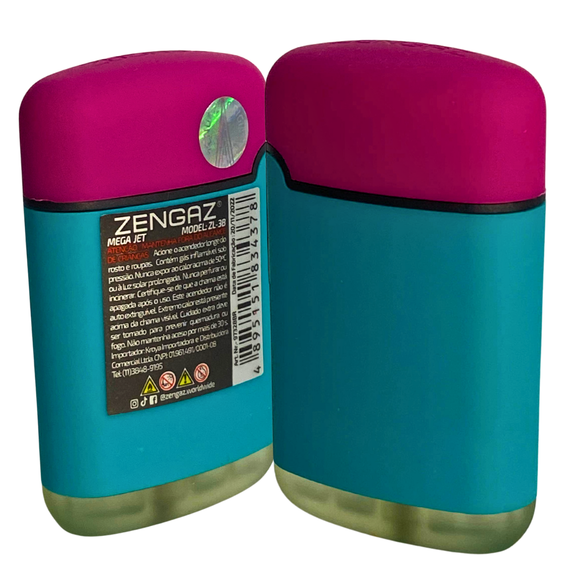Isqueiro maçarico Zengaz ZL-3B Mega Jet bicolor, recarregável a gás butano, chama tipo jato resistente ao vento, corpo compacto em plástico, display com 12 unidades sortidas.