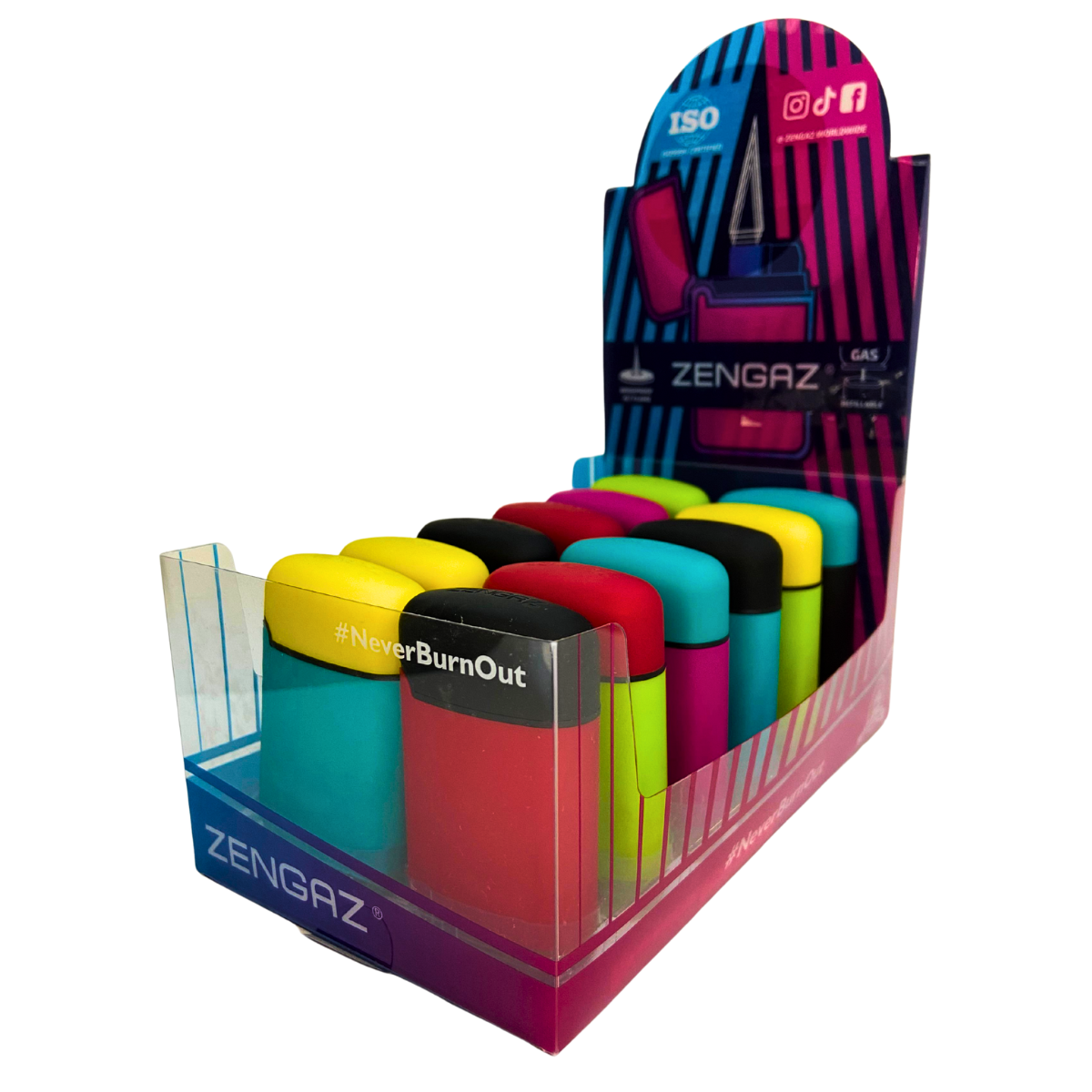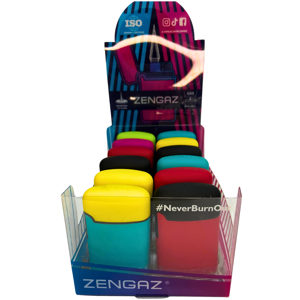 Cada unidade comercial corresponde a 1 display com 12 isqueiros maçarico Zengaz ZL-3B Mega Jet Bicolor em cores sortidas. Esse formato é adequado para revenda de isqueiro maçarico em balcões e expositores de lojas especializadas.