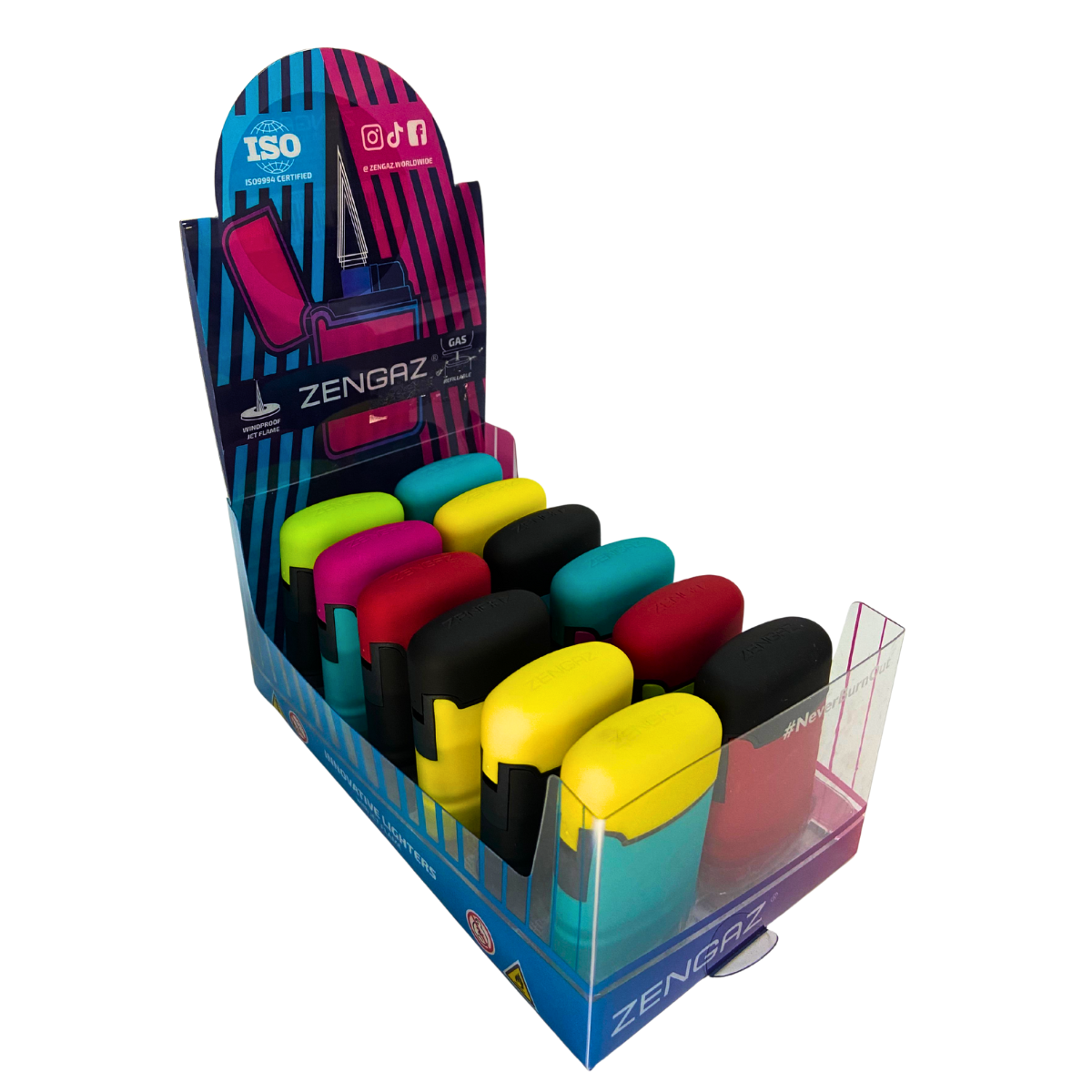 1 (um) display com 12 (doze) isqueiros maçarico Zengaz ZL-3B Mega Jet bicolor, em cores sortidas.