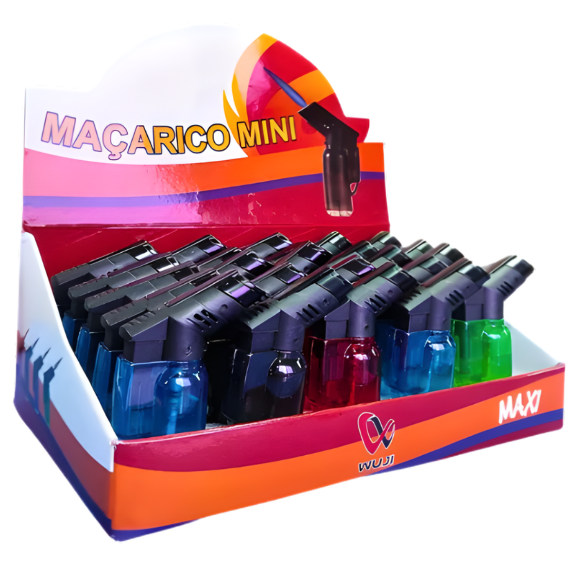 Por normas de transporte e segurança, displays de mini maçarico como o Wuji geralmente são enviados sem carga ou com carga mínima de gás. Recomenda-se abastecer cada unidade com gás butano apropriado para maçaricos e isqueiros antes do primeiro uso, conforme as instruções do fabricante.