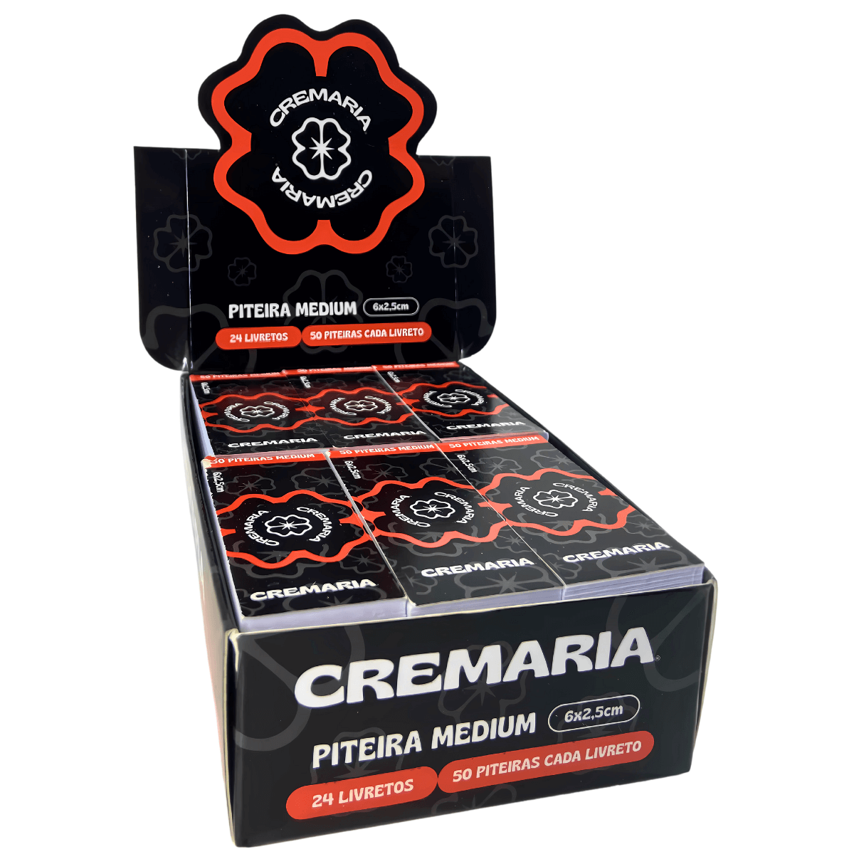 Piteira de papel Cremaria tamanho Medium na cor preta, em livreto. Display com 24 unidades, cada uma com 50 piteiras destacáveis para montagem e acabamento padronizado.