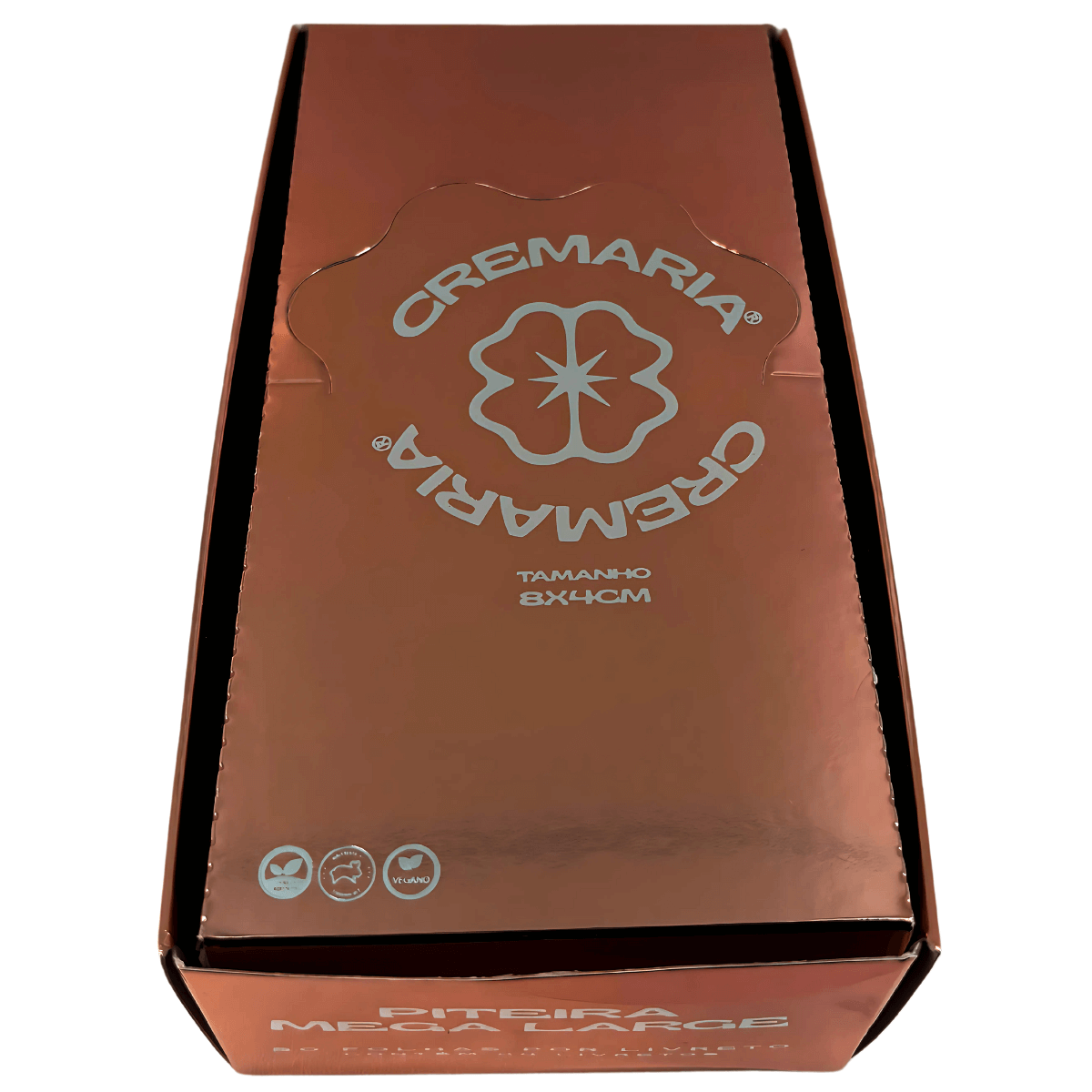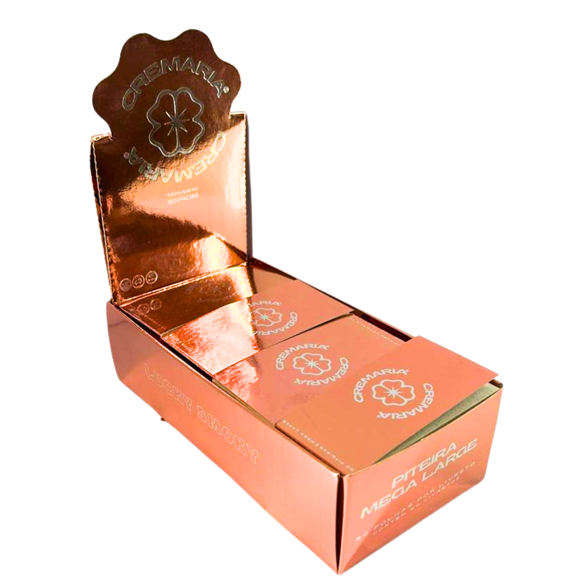 Trata-se de um display da marca Cremaria com 20 livretos de piteira de papel Mega Large, na versão Rose. Cada livreto reúne piteiras alongadas, com corte padronizado e papel de boa resistência, voltadas ao uso em conjunto com sedas e demais acessórios compatíveis.