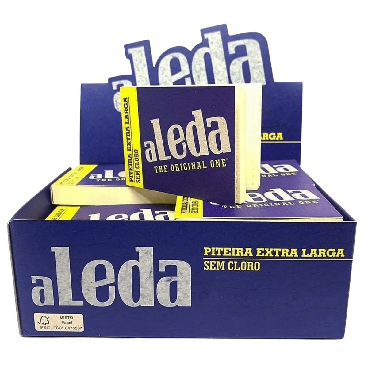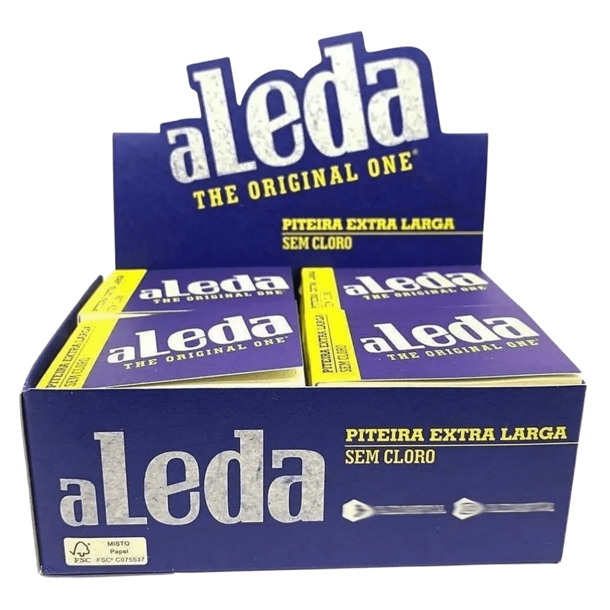 1 (um) display de Piteira de Papel Aleda Azul Extra Larga, com 20 (vinte) livretos de 50 (cinquenta) folhas cada, acondicionado em embalagem individual.