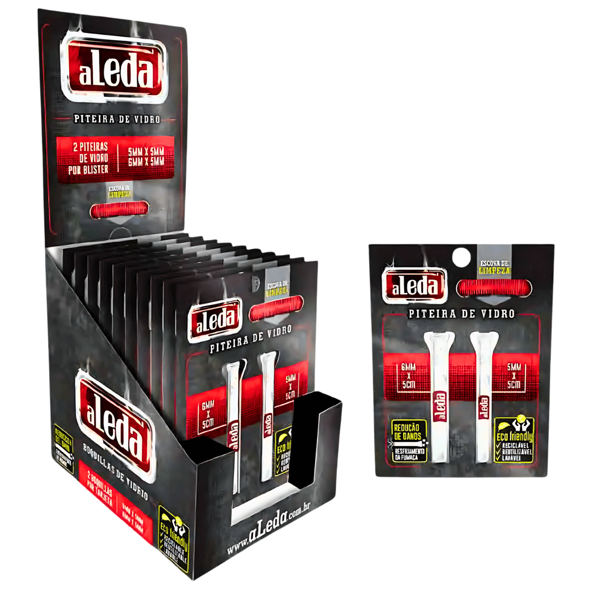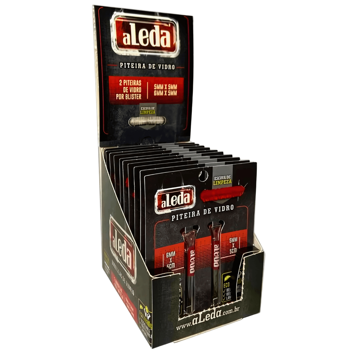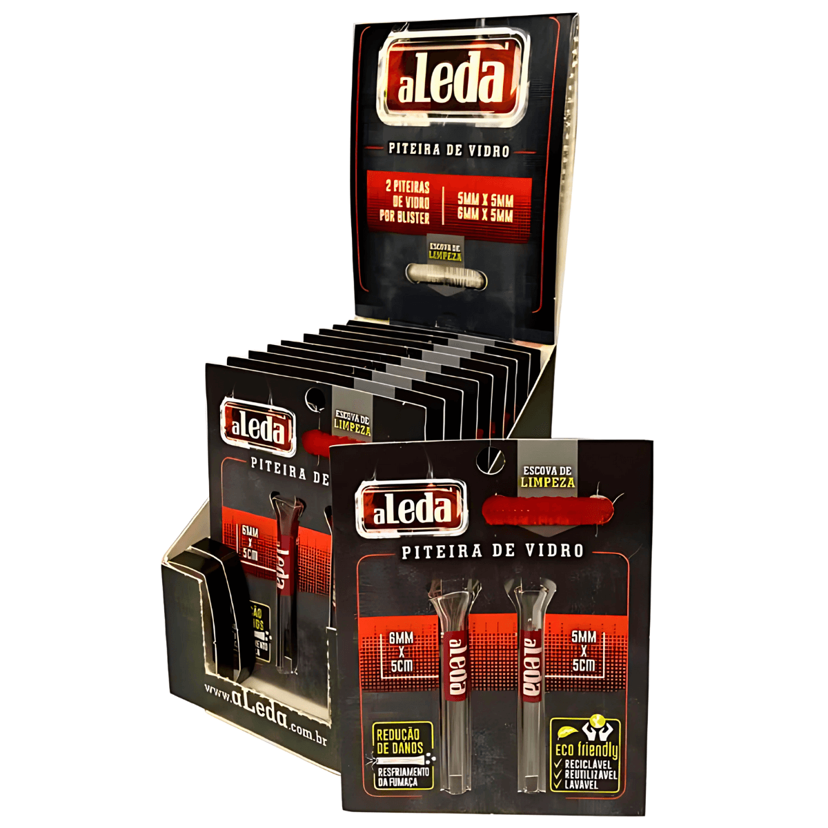 1 (um) display com 10 (dez) cards de piteiras de vidro Aleda, acondicionado em embalagem individual.