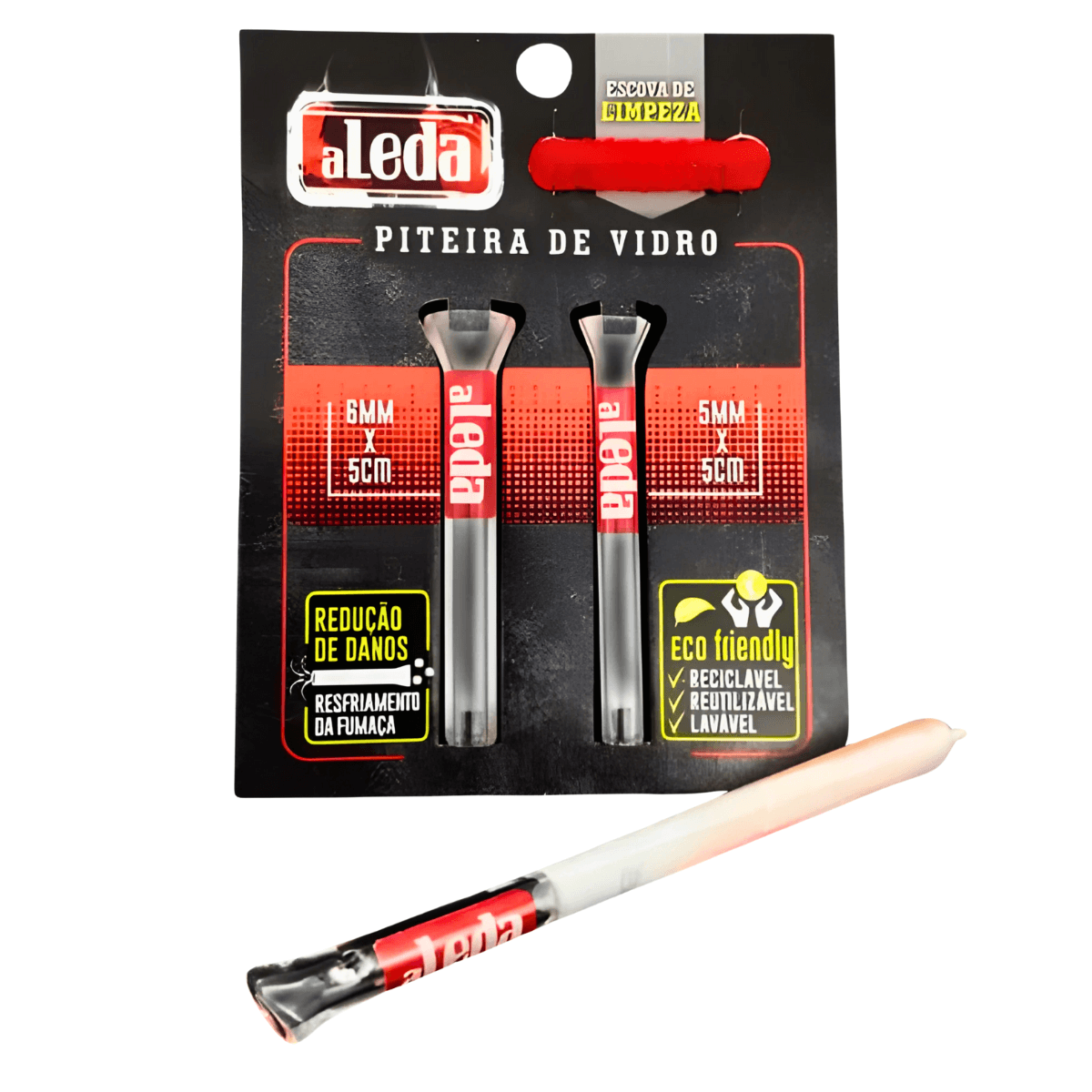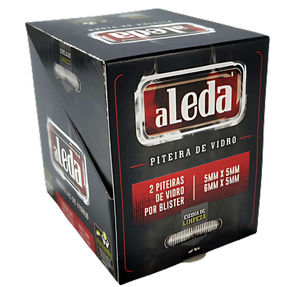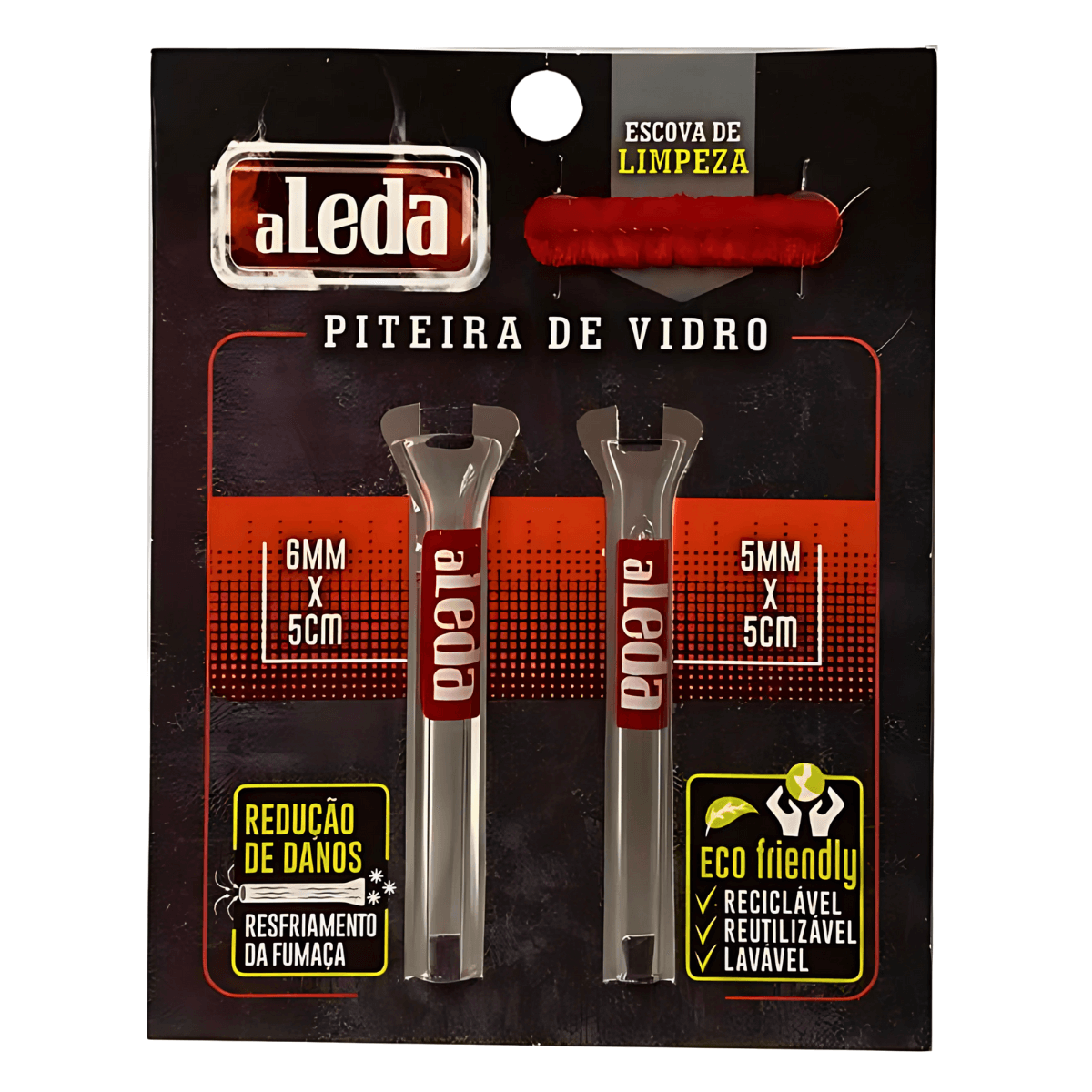 1 (um) display com 10 (dez) cards de piteiras de vidro Aleda, acondicionado em embalagem individual.