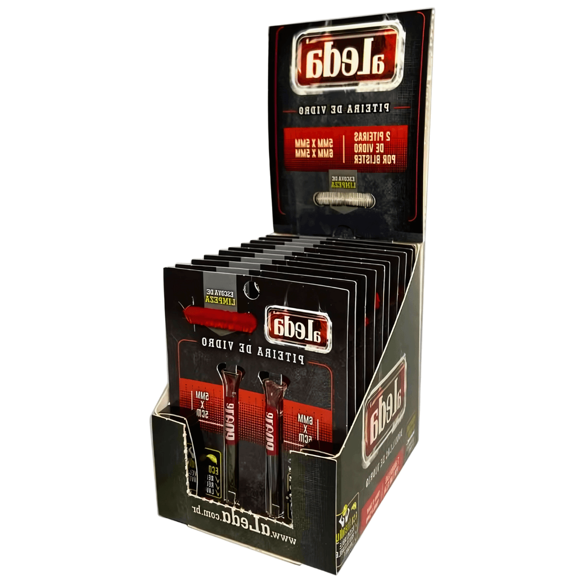 O display contém 10 (dez) cards, e cada card inclui 2 (duas) piteiras, totalizando 20 (vinte) piteiras de vidro Aleda.