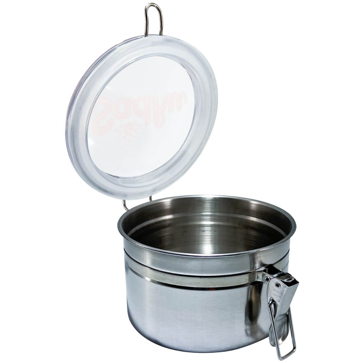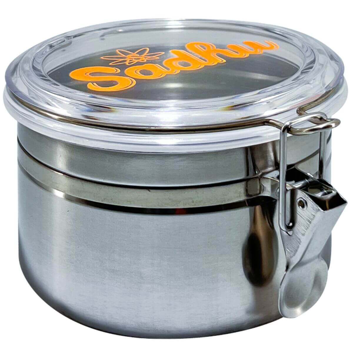 Pote hermético Sadhu em aço inoxidável com vedação em borracha e capacidade aproximada de 224 g, indicado para armazenamento protegido contra umidade e odores externos.