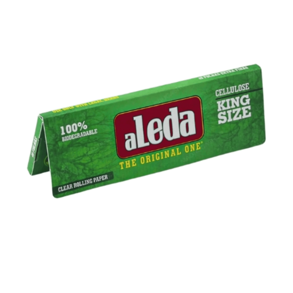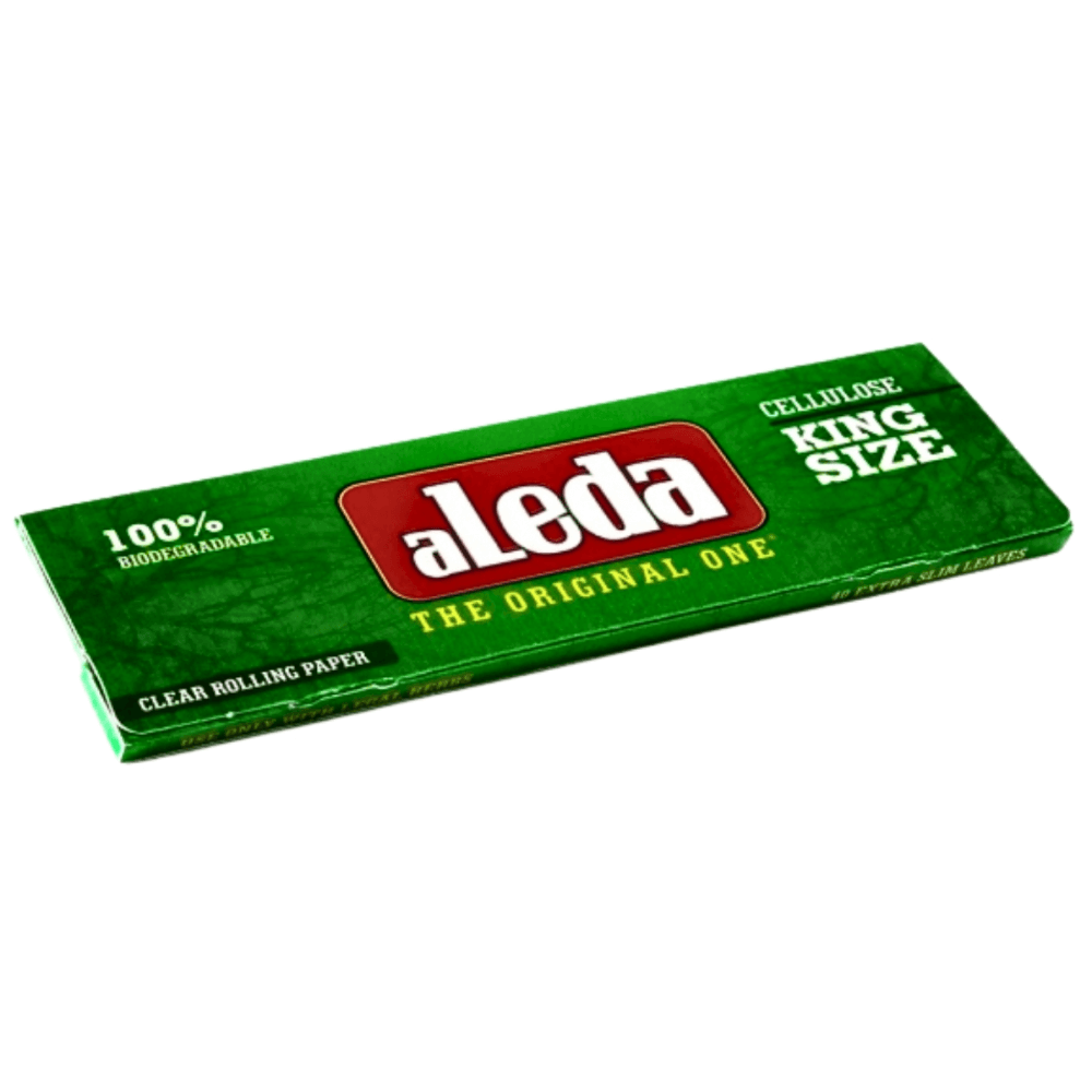 Seda de celulose transparente Aleda em formato King Size, com display de 20 livretos. Cada livreto contém 40 folhas para enrolar, com queima lenta e acabamento extrafino.