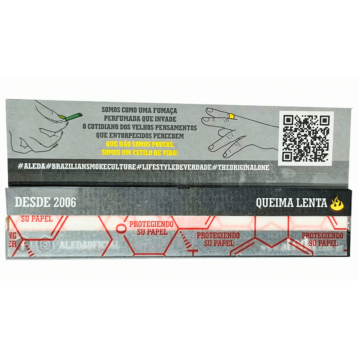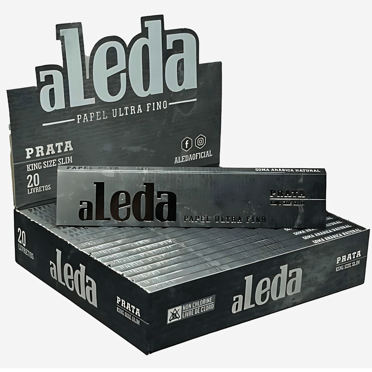 A Seda Aleda Prata King Size Slim é um papel para enrolar em formato alongado e estreito, com folhas brancas extra finas e combustão lenta. Cada livreto reúne folhas padronizadas, com marca d’água que auxilia no controle de qualidade visual, mantendo a identidade da marca Aleda em todo o lote.
