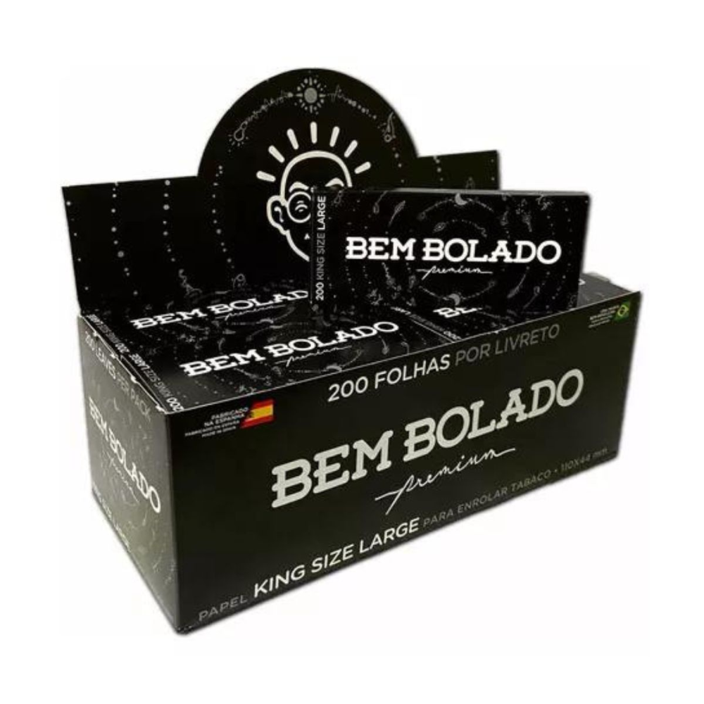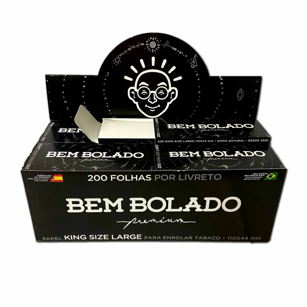 Seda Bem Bolado Premium King Size Large em display com 40 livretos de 200 folhas (110 x 44 mm). Papel branco ultrafino 13 g/m², sem cloro, com goma natural.