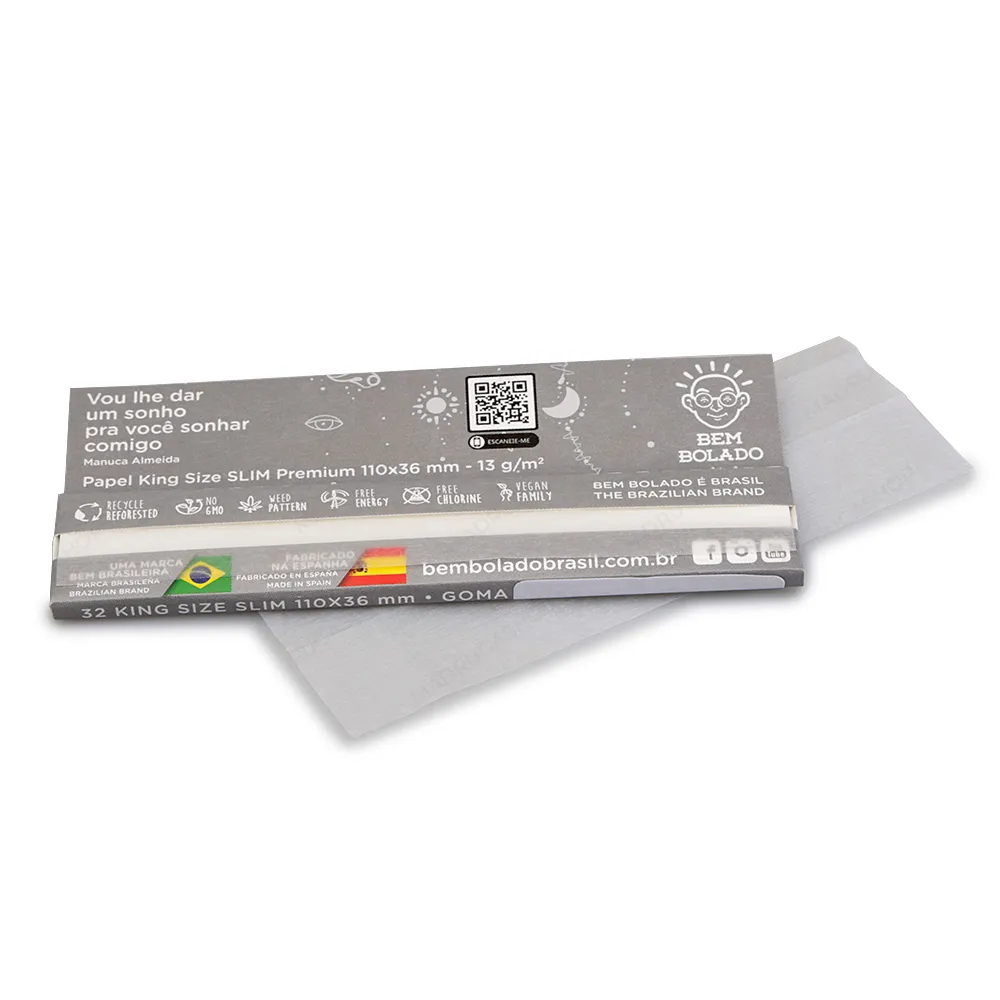 O tamanho King Size Slim (aprox. 110 x 36 mm) oferece área de enrolagem ampla em um formato mais fino. Cada livreto conta com 32 folhas, ajudando a padronizar o consumo por unidade e facilitar o controle de estoque.