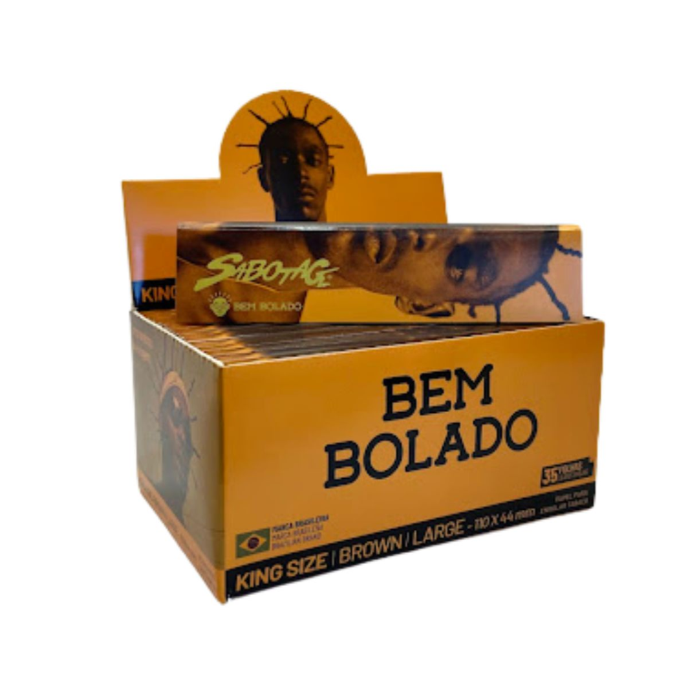 Display com 30 livretos de seda Bem Bolado Brown Sabotage King Size Large, com 35 folhas por livreto, papel marrom não refinado e queima lenta.