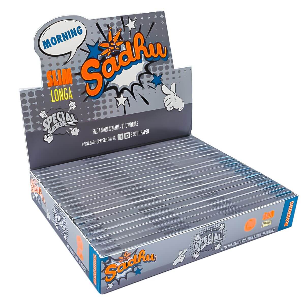 A Seda Sadhu Morning Longa Slim é um papel de seda longa no formato slim, desenvolvido para quem busca padronização e praticidade no uso de folhas alongadas. O display reúne 21 livretos da linha Morning, oferecendo uma solução organizada para pontos de venda que trabalham com papel de seda em grande rotatividade.