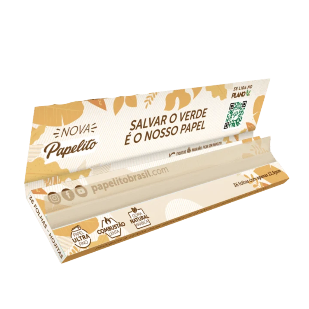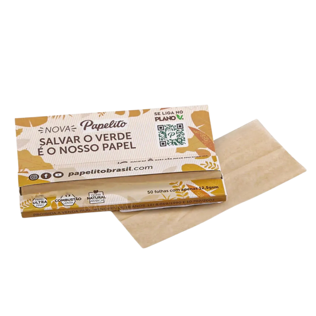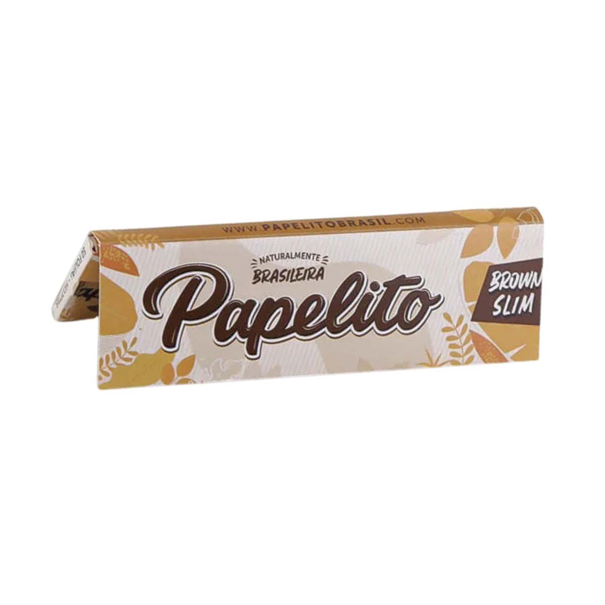 A linha Brown da Papelito utiliza papel marrom não branqueado, mantendo um aspecto mais natural e rústico. Aliado à baixa gramatura e à goma arábica natural, o resultado é uma folha fina, com queima lenta e discreta, muito utilizada por quem procura papéis para enrolar com características técnicas semelhantes às dos principais fornecedores de sedas premium.