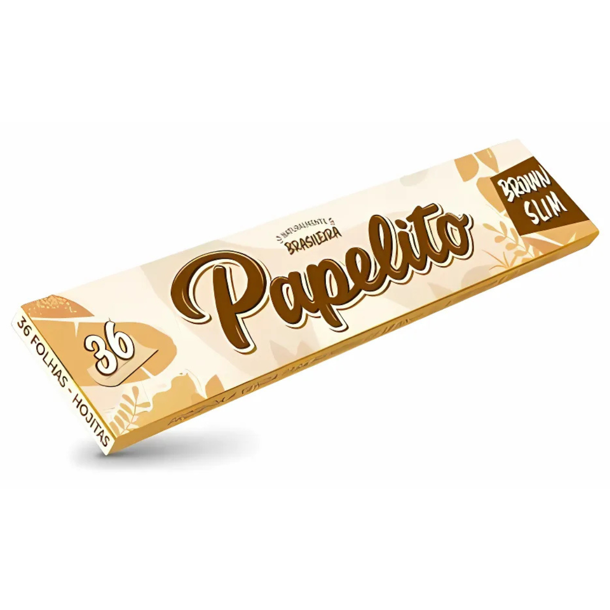 As folhas da Seda Papelito Brown Slim King Size possuem formato longo e estreito, com medidas aproximadas de 108 x 36 mm, padrão king size slim. Esse formato resulta em cilindros mais finos e compridos, atendendo a usuários e estabelecimentos que preferem papéis para enrolar com dimensões padronizadas e compatíveis com a linha Brown Slim.