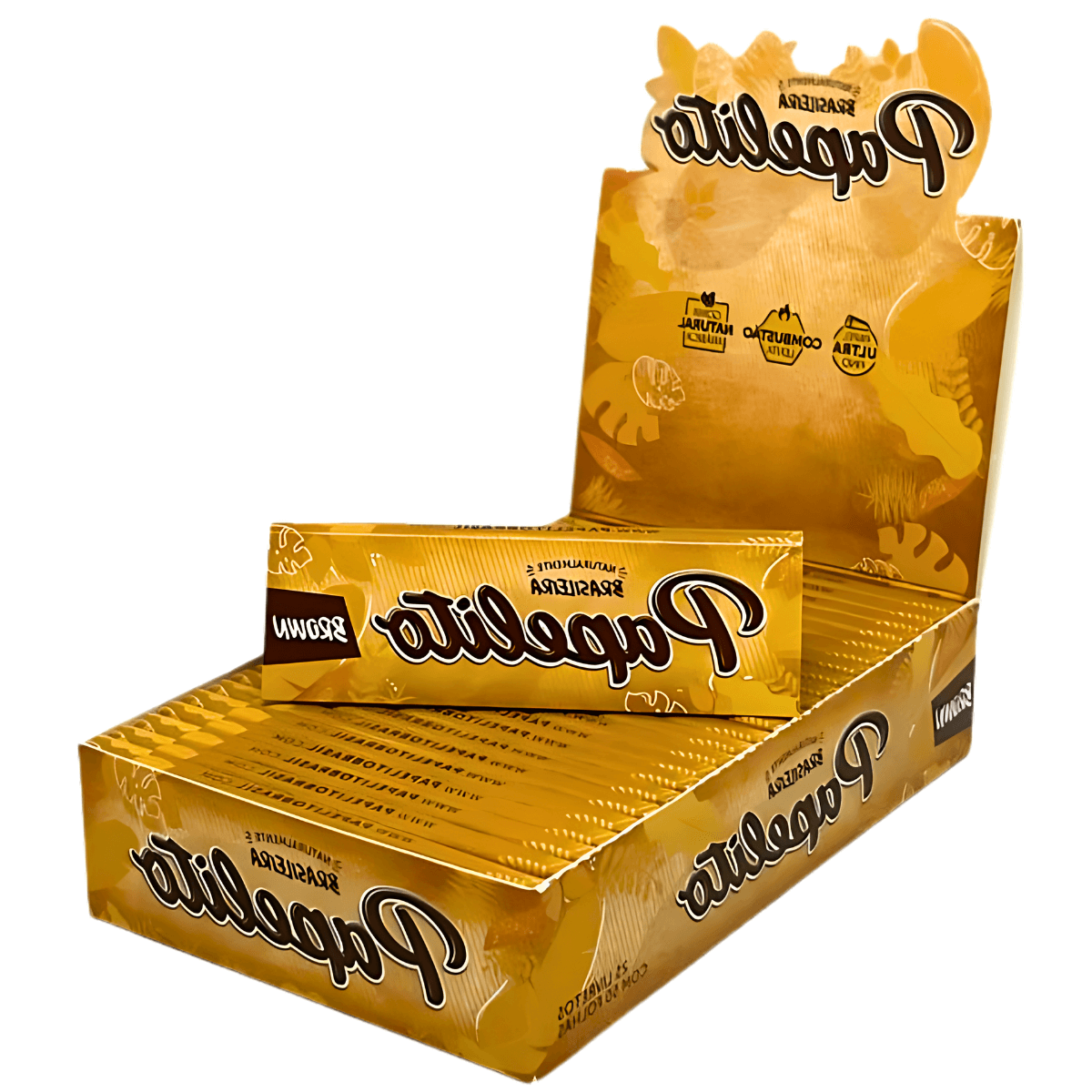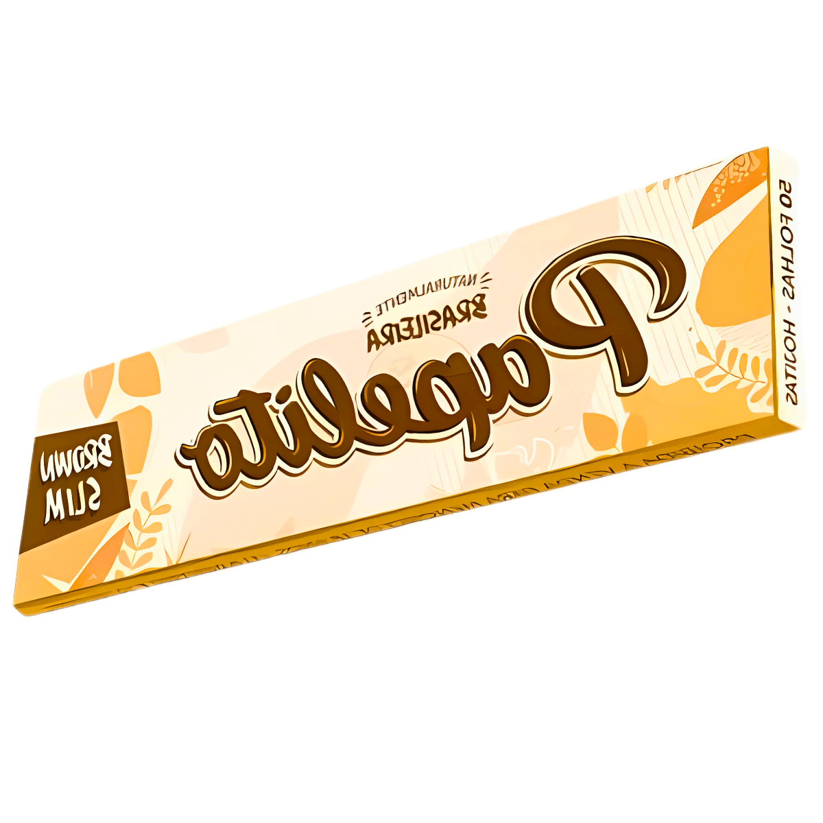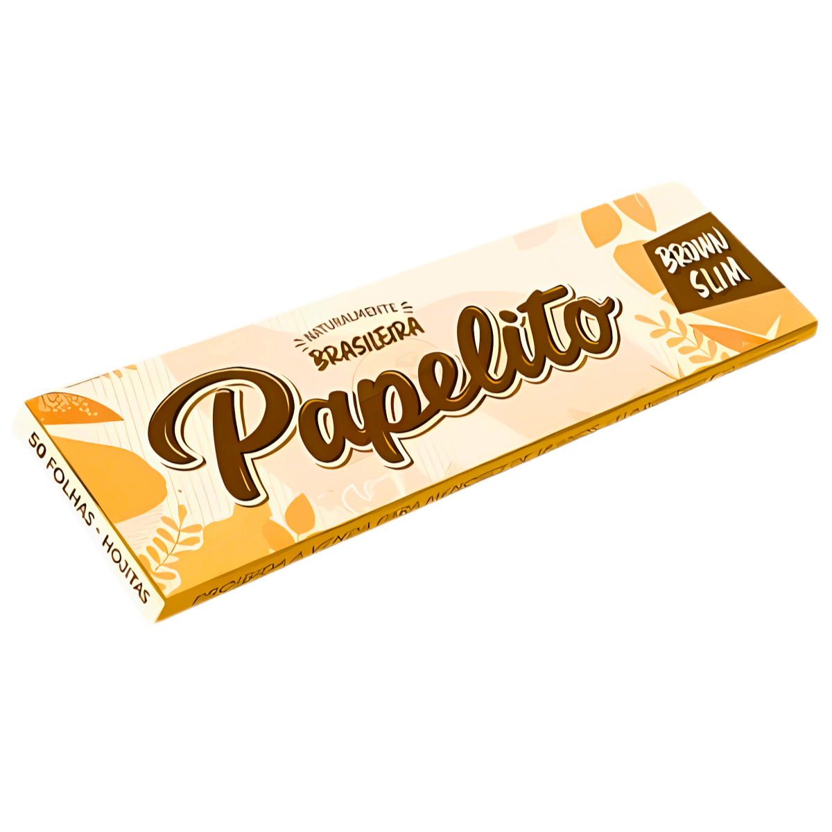 Seda Papelito Brown Slim Mini Size em papel não branqueado, formato slim 78x36mm, com goma arábica natural. Display com 25 livretos, 50 folhas por livreto.