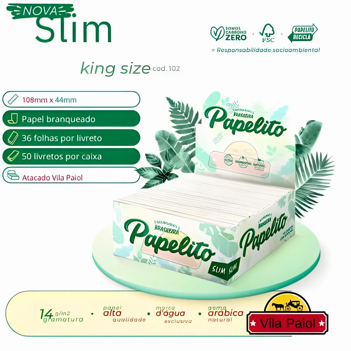 A Vila Paiol atua como atacadista e distribuidor da Seda Papelito Slim King Size Display com 50 livretos, oferecendo fornecimento contínuo, lote padronizado e integração deste item ao sortimento de papéis para enrolar de marcas reconhecidas. O foco está em manter regularidade de entrega e alinhamento com as especificações oficiais do fabricante, facilitando o planejamento de compra com distribuidor especializado.
