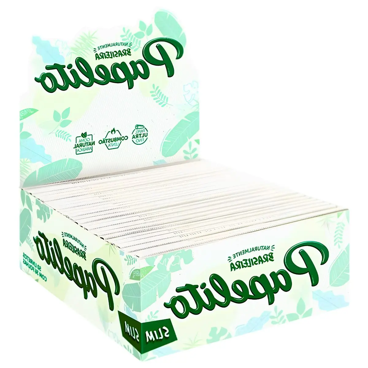 Display com 50 livretos de seda Papelito Slim King Size, papéis ultrafinos 108 x 36 mm, 36 folhas por livreto, queima lenta e tonalidade branca.