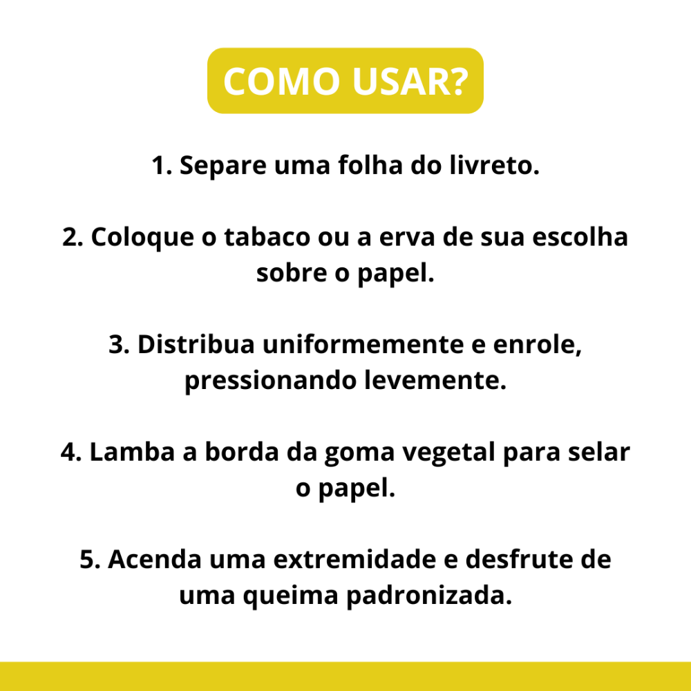 As folhas têm 108 mm de comprimento por 36 mm de largura, no padrão Slim King Size, adequado para quem precisa de papel longo e estreito.